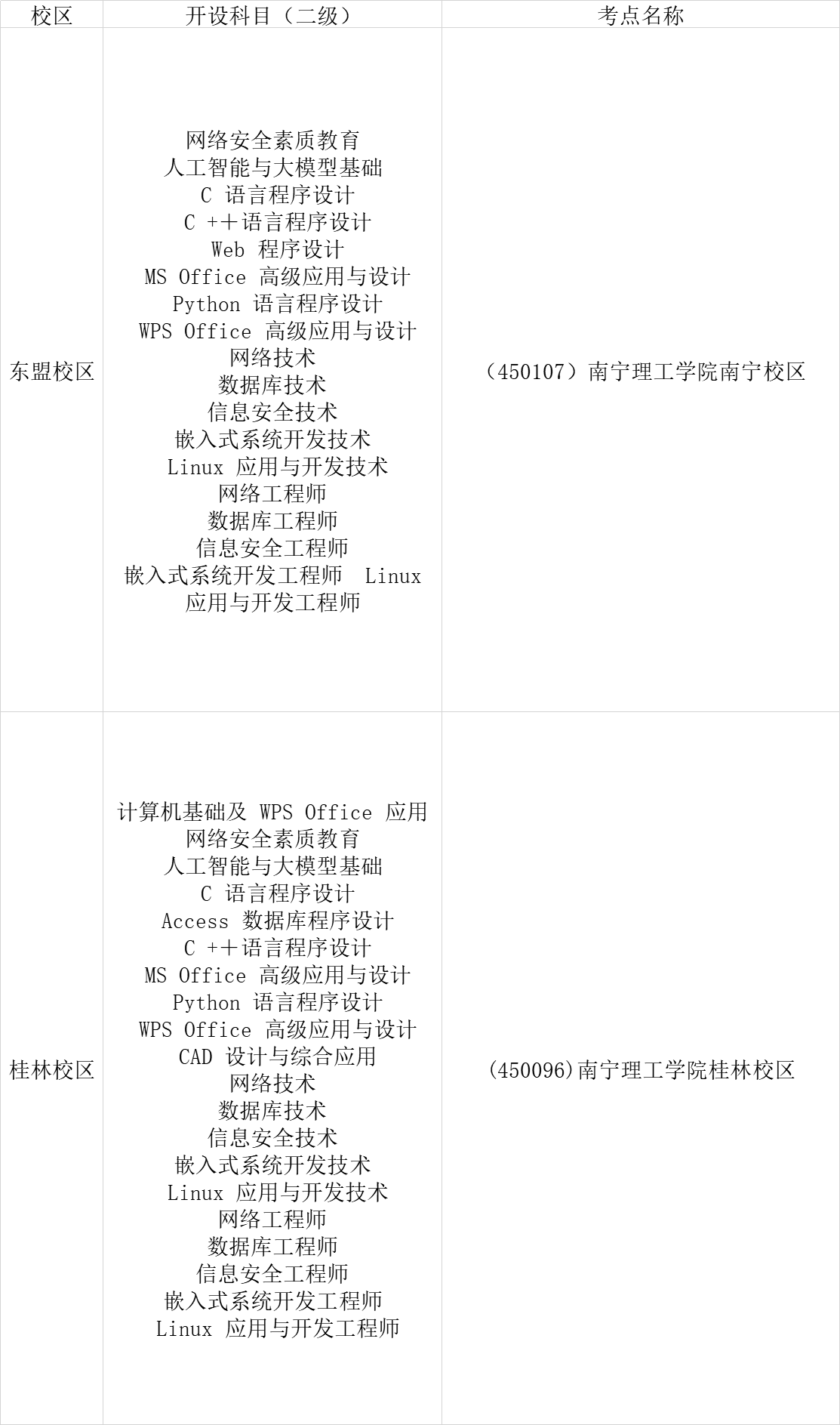 本次考试我校各校区开考科目如下表所示,请各位考生认真核对报考考点。