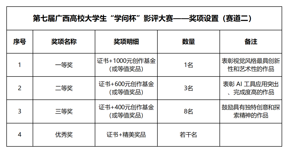 为深入贯彻落实习近平总书记关于美育的重要讲话精神,贯彻落实中共中央办公厅、国务院办公厅《关于全面加强和改进新时代学校美育工作的意见》,积极探索人工智能技术在影视艺术赏析与创作领域的创新应用,引导高校师生以影鉴史、以笔抒怀,全面提升审美鉴赏能力与数字人文素养,搭建感悟时代精神、抒发家国情怀的优质文化交流平台,助力校园文化建设与全民阅读工作提质增效,广西高等教育学会图书馆专业委员会特举办以“影卷启灵思 翰墨书山河”为主题的第七届广西高校大学生“学问杯”影评大赛。现将有关事项通知如下: