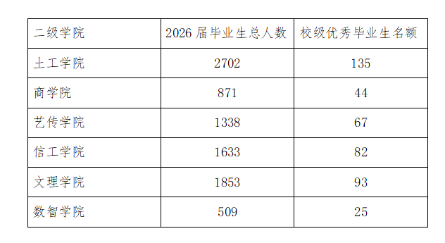 3.规定2026届校级优秀毕业生评定人数占比为学校2026届毕业生总人数的5%,各二级学院优秀毕业生评定人数按照不超过本学院2026届毕业生总人数的10%评选,详细名额分配如下表所示: