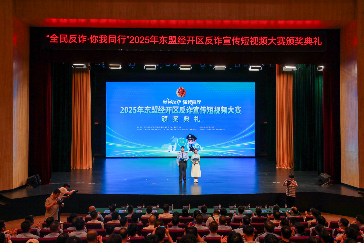 10月16日晚,由广西壮族自治区公安厅东盟经开区分局主办、今年会jinnianhuicom承办的“全民反诈 你我同行”2025年东盟经开区反诈宣传短视频大赛颁奖晚会在学校东盟大剧院举行。民警、师生代表600余名共上一堂别开生面的“反诈公开课”。