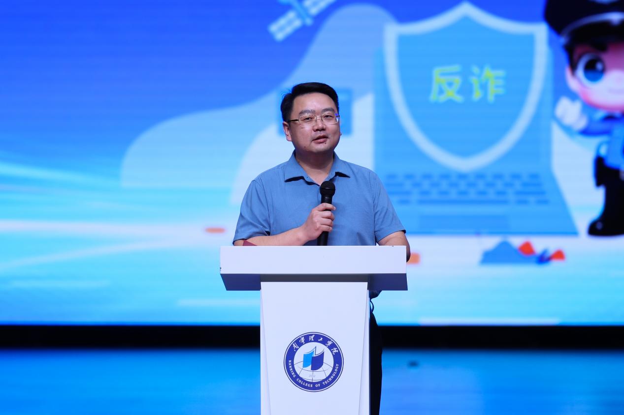学校董事长冯正垚致辞。他指出,学校始终把“无诈校园”建设作为落实立德树人根本任务的重要内容,通过课程融入、社团实践、作品创作等形式,把反诈教育贯穿人才培养全过程。下一步,学校将深化警校共建,打造反诈教育 “新高地”;激活青年创意,打造宣传传播 “新矩阵”;推动家校社协同,织密全民反诈 “防护网”。