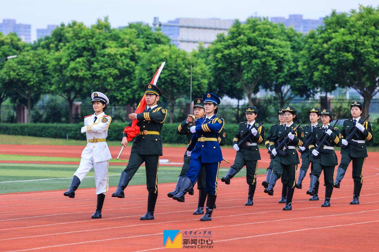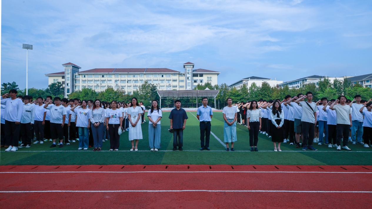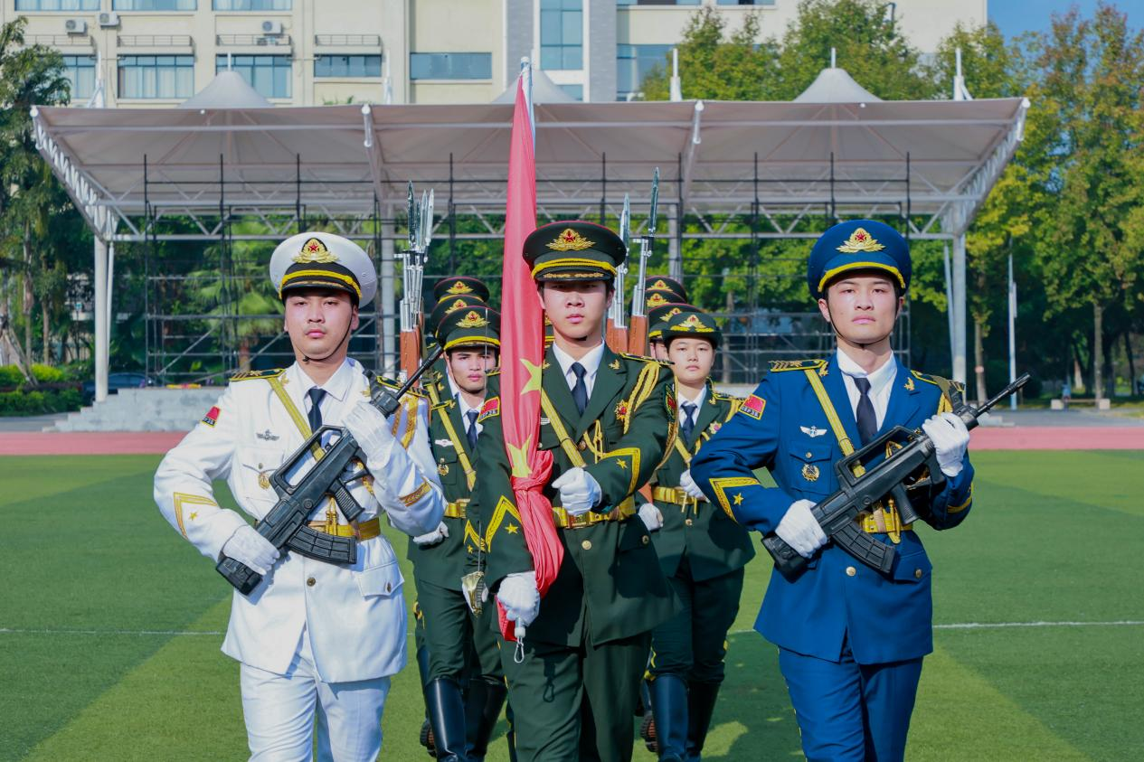 国旗护卫队身着整齐制服,迈着铿锵有力的步伐,庄严护送五星红旗正步走向旗杆。激昂雄壮的《义勇军进行曲》奏响,鲜艳的五星红旗在全体师生的注目礼中冉冉升起。现场师生神情肃穆,齐声高唱国歌,表达对祖国的深深热爱和崇高敬意。