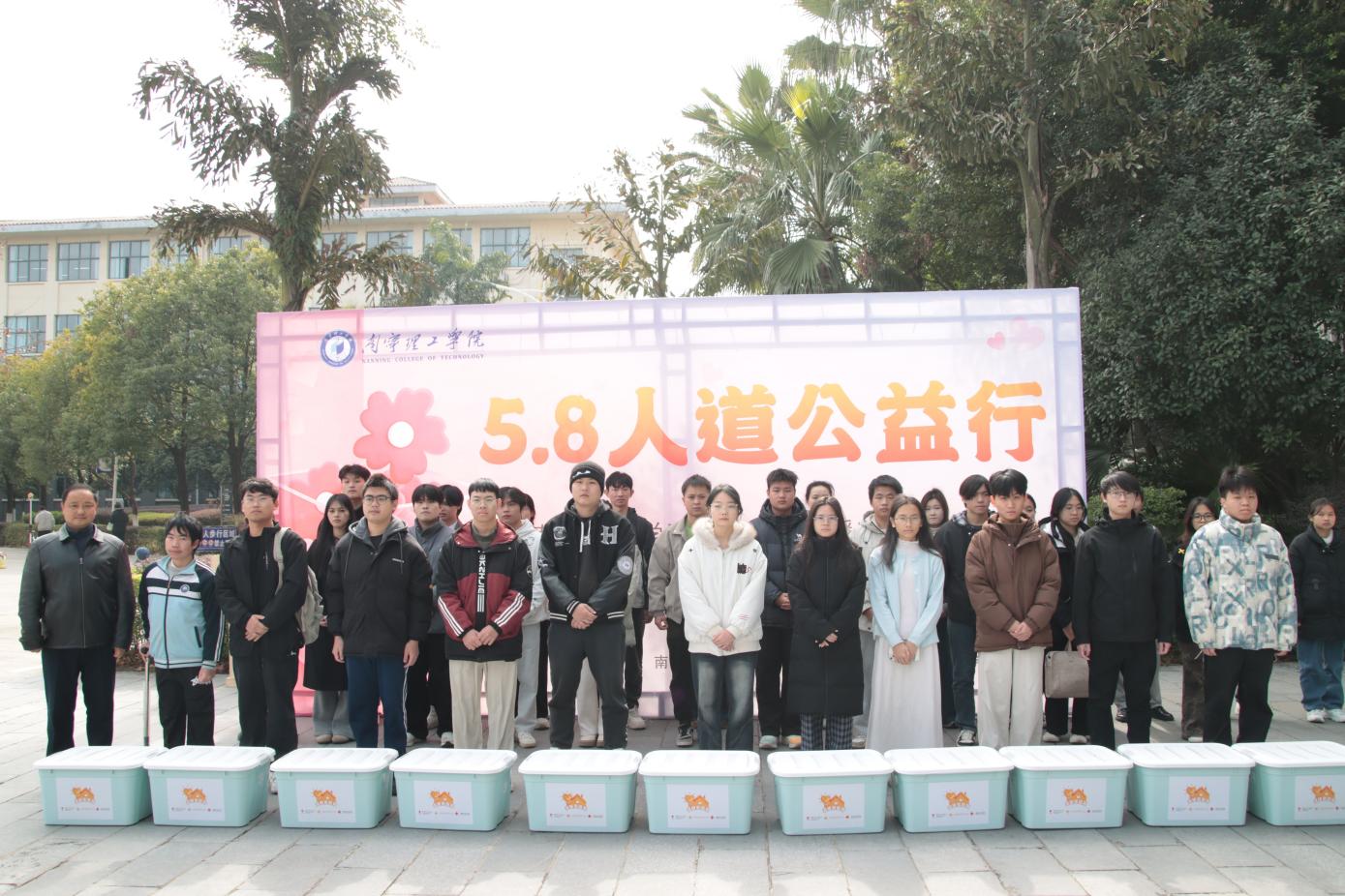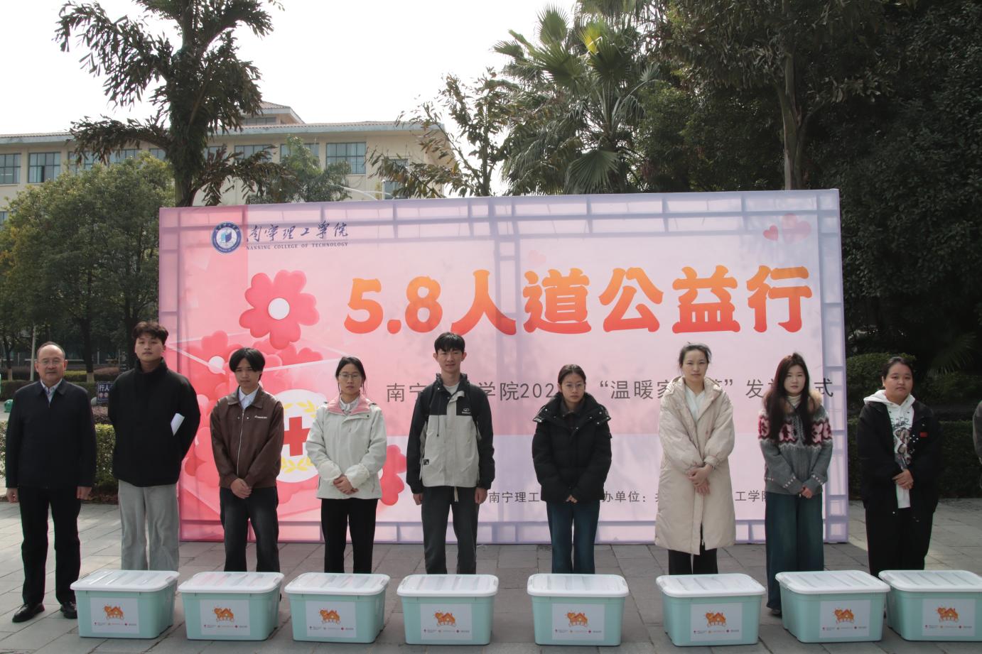 发放仪式结束后,校领导与学生代表在背景板前合影留念,定格下这一温暖瞬间。本次活动不仅为学生送去了物质上的帮扶,更给予了精神上的鼓励,进一步营造了“友爱互助、公益同行”的良好校园氛围。