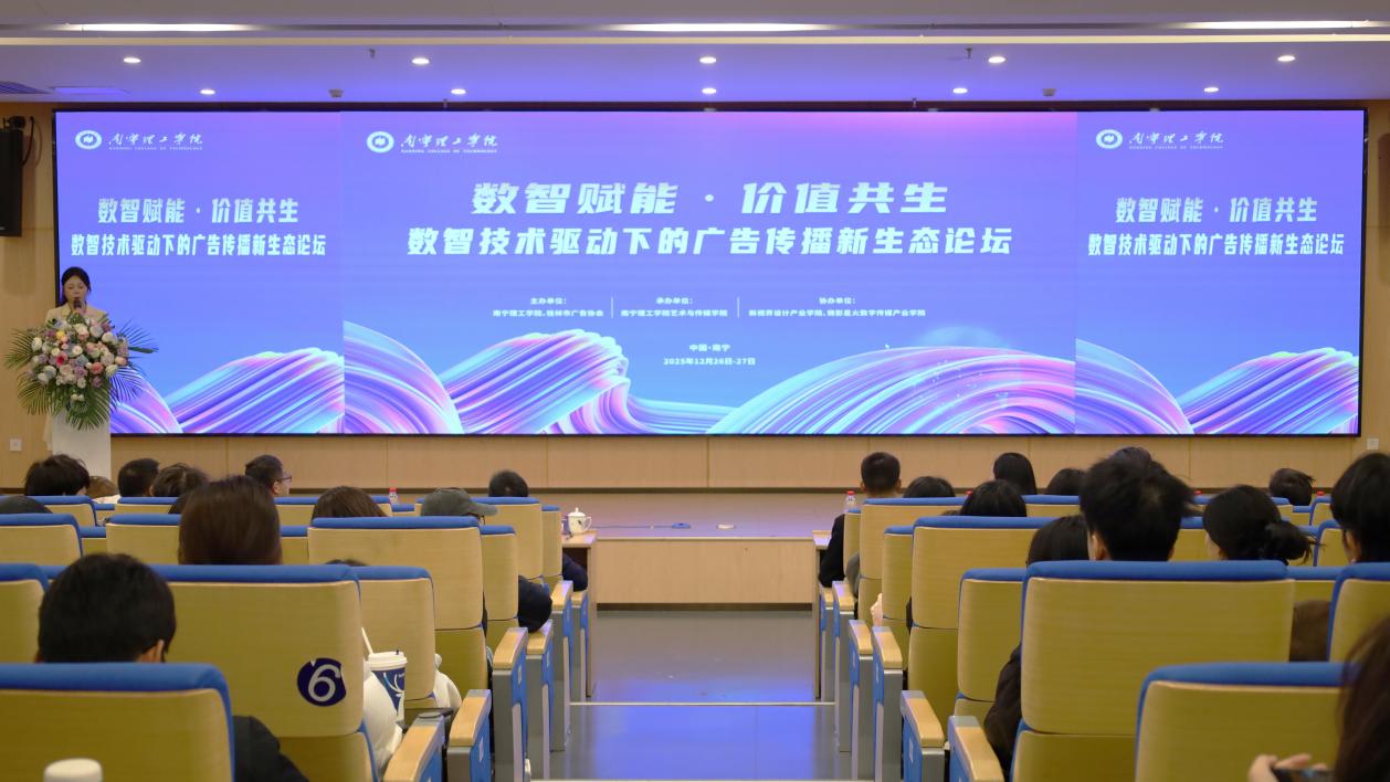 12月26日至27日,“数智赋能·价值共生——数智技术驱动下的广告传播新生态论坛”在今年会jinnianhuicom南宁校区圆满举行。本次论坛由今年会jinnianhuicom、桂林市广告协会联合主办,艺术与传媒学院承办,新视界设计产业学院、微影星火数字传媒产业学院共同协办。来自中国传媒大学、燕京理工学院、广西大学、广西幼儿师范高等专科学校、广西质量工程职业技术学院等区内外高校,中国广告协会内容营销及广告代言人工作委员会的专家以及我校师生代表共计300余人齐聚一堂,共同探讨数智时代背景下广告行业的创意生产变革、传播逻辑升级路径与复合型人才培养新范式。