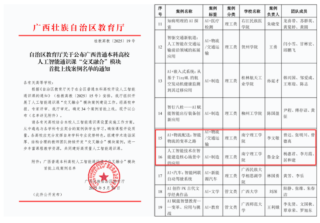 喜报!我校两案例入选广西普通本科高校人工智能通识课“交叉融合”模块首批上线案例名单
