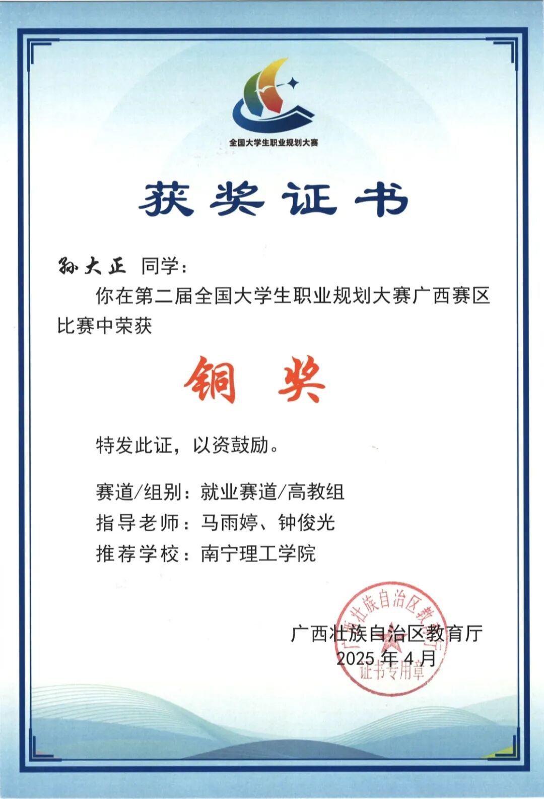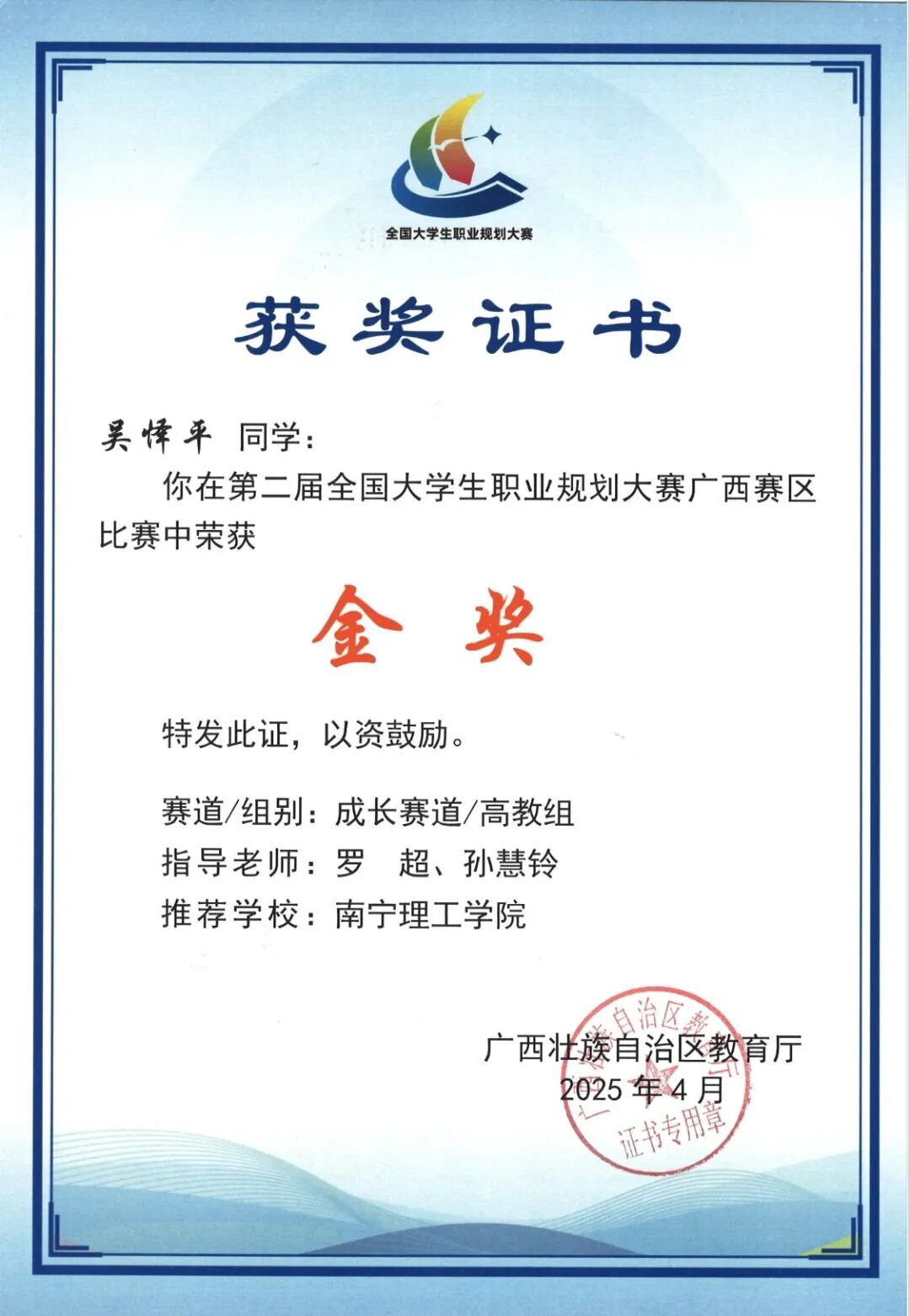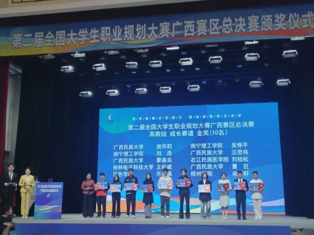 在比赛中,我校学子表现亮眼:吴怿平同学荣获全国总决赛铜奖一项;吴怿平同学和刘浩同学凭借清晰的职业定位、可行的发展规划及对行业趋势的精准把握,双双荣获广西赛区比赛金奖两项、孙大正同学荣获广西赛区比赛铜奖、揭成威同学也以扎实的规划方案获得广西赛区比赛优秀奖。