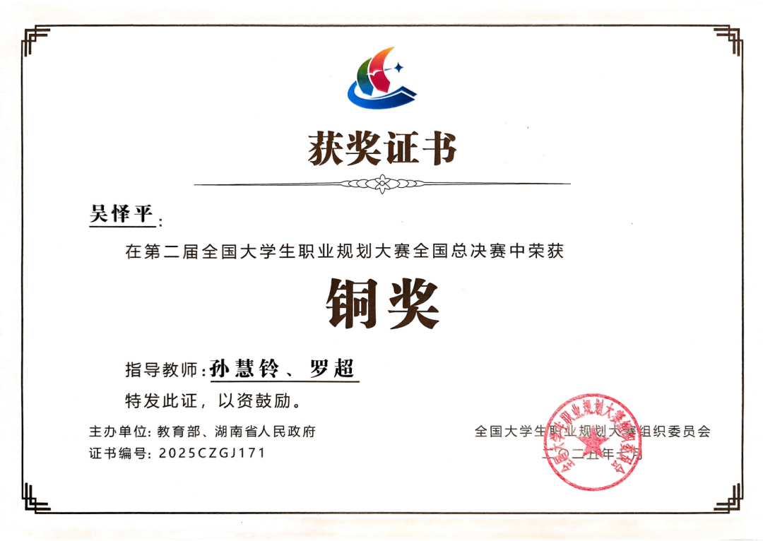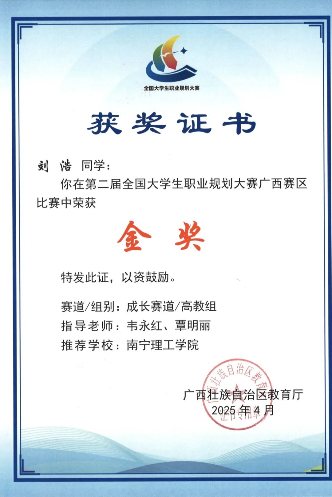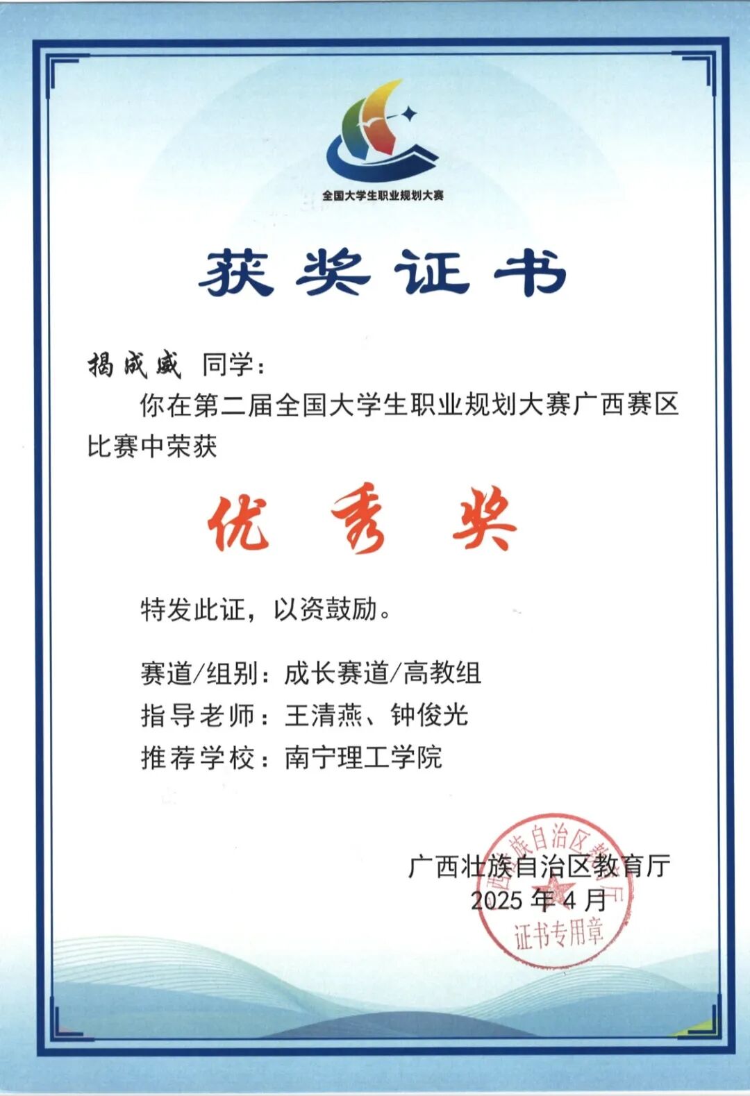 在比赛中,我校学子表现亮眼:吴怿平同学荣获全国总决赛铜奖一项;吴怿平同学和刘浩同学凭借清晰的职业定位、可行的发展规划及对行业趋势的精准把握,双双荣获广西赛区比赛金奖两项、孙大正同学荣获广西赛区比赛铜奖、揭成威同学也以扎实的规划方案获得广西赛区比赛优秀奖。