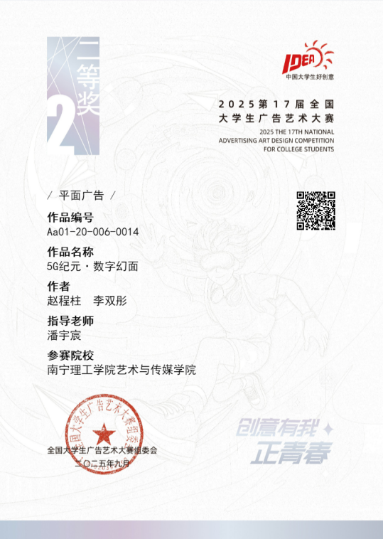 近日,我校艺术与传媒学院学生在第17届全国大学生广告艺术大赛中荣获国家级奖项15项。其中,作品《5纪元·数字幻面》获得全国二等奖;作品《“头”等大事,不容闪失》《一袋》《胃是第二个“心”》获得全国三等奖;另有11项作品获得全国优秀奖;邱野等教师荣获大赛优秀指导教师称号;获奖等级与数量创历史新高,学校获评“优秀参赛院校”。