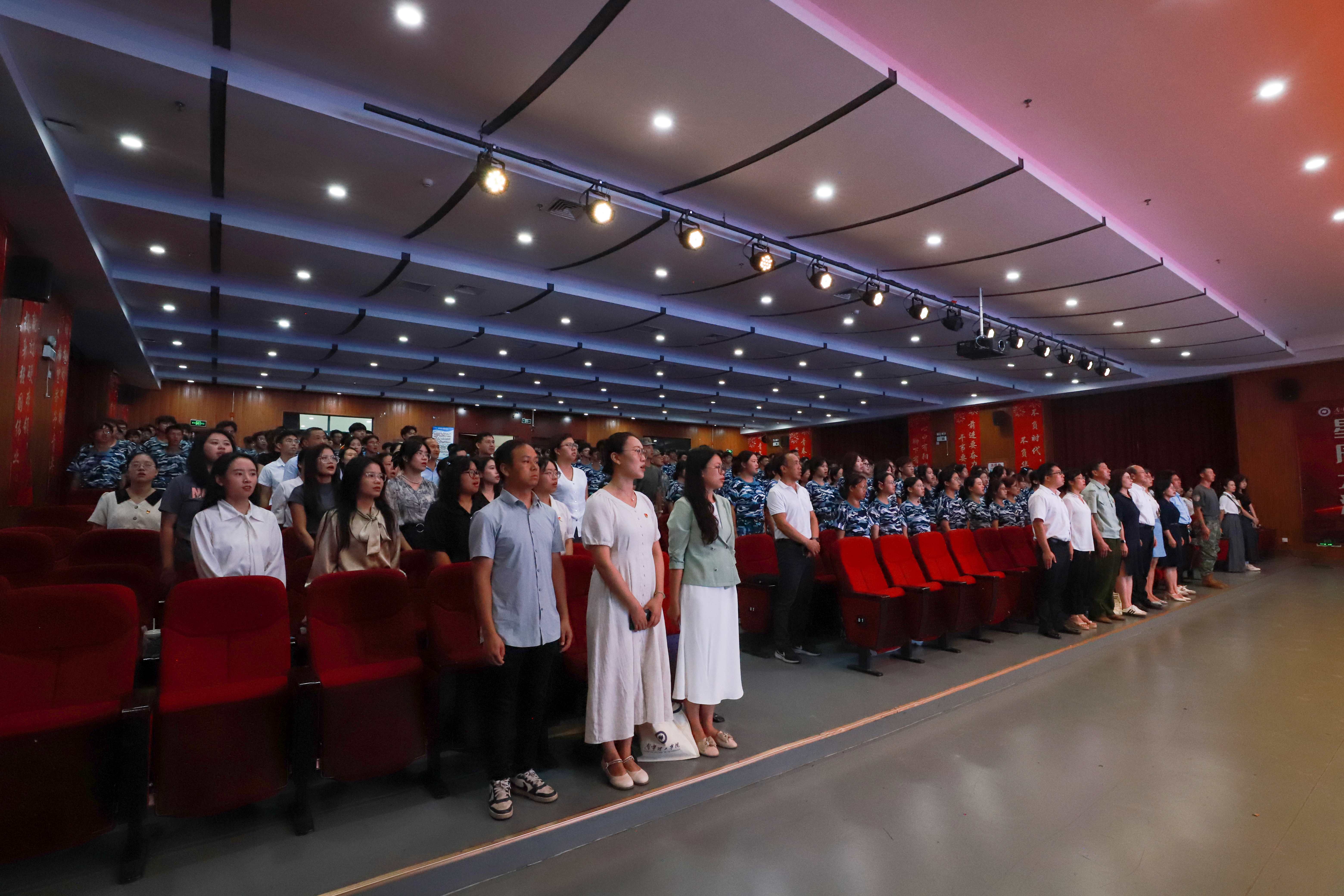 当激昂的国歌奏响,那雄浑的旋律如汹涌浪潮,穿透屏幕,瞬间激荡起全体师生内心深处的爱国情怀。鲜艳的五星红旗在屏幕上冉冉升起,全体人员目光坚定,神情肃穆,紧紧凝视着那象征着国家尊严与荣耀的红色旗帜,爱国之情如燎原之火,在现场熊熊燃烧。