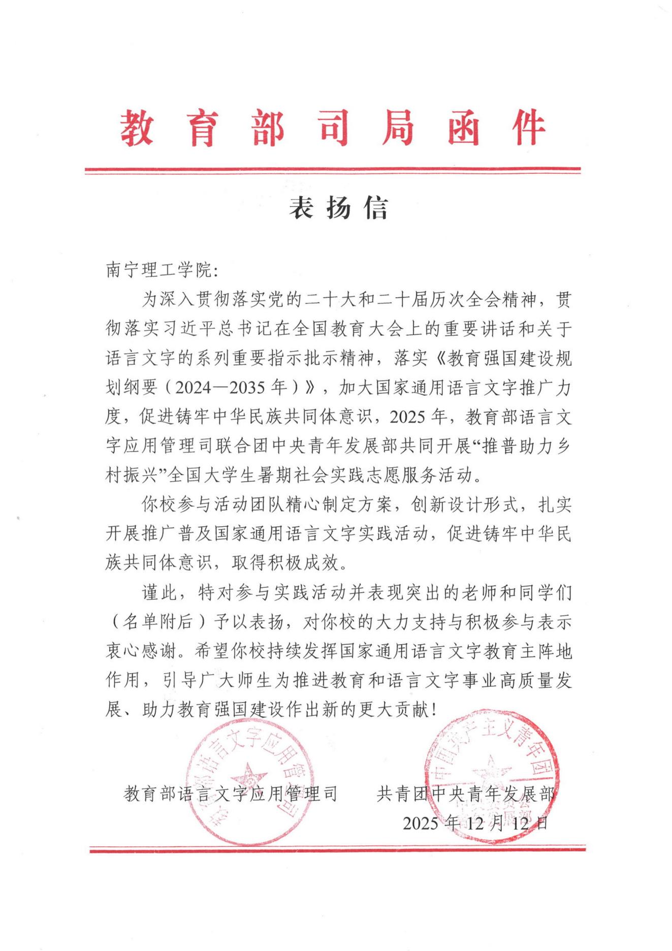 教育部与团中央在表扬信中充分肯定了团队的实践成果,并对我校的支持工作表示感谢。此次表彰既是对团队的高度认可,也是对我校实践育人工作的积极肯定。