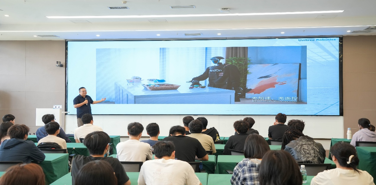 互动交流环节中,宇树科技技术团队现场演示机器人在电力巡检、文旅导览、智能制造等多元场景的实际应用,以直观形式展现具身智能技术的落地成效与创新潜力。同学们踊跃提问、积极互动,围绕技术研发、应用前景、职业发展等问题与主讲嘉宾深入探讨,现场氛围热烈浓厚、学术交流氛围浓郁。