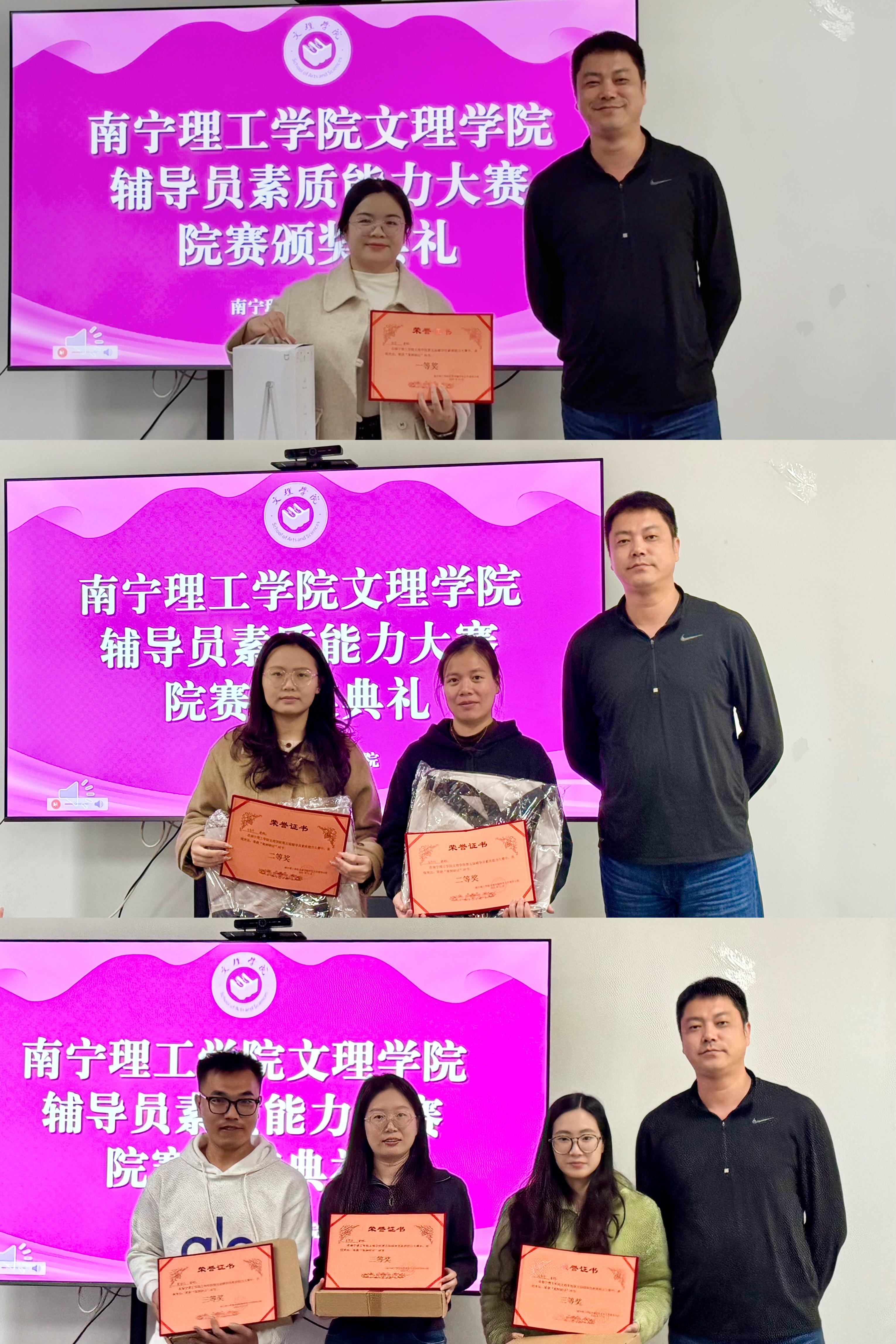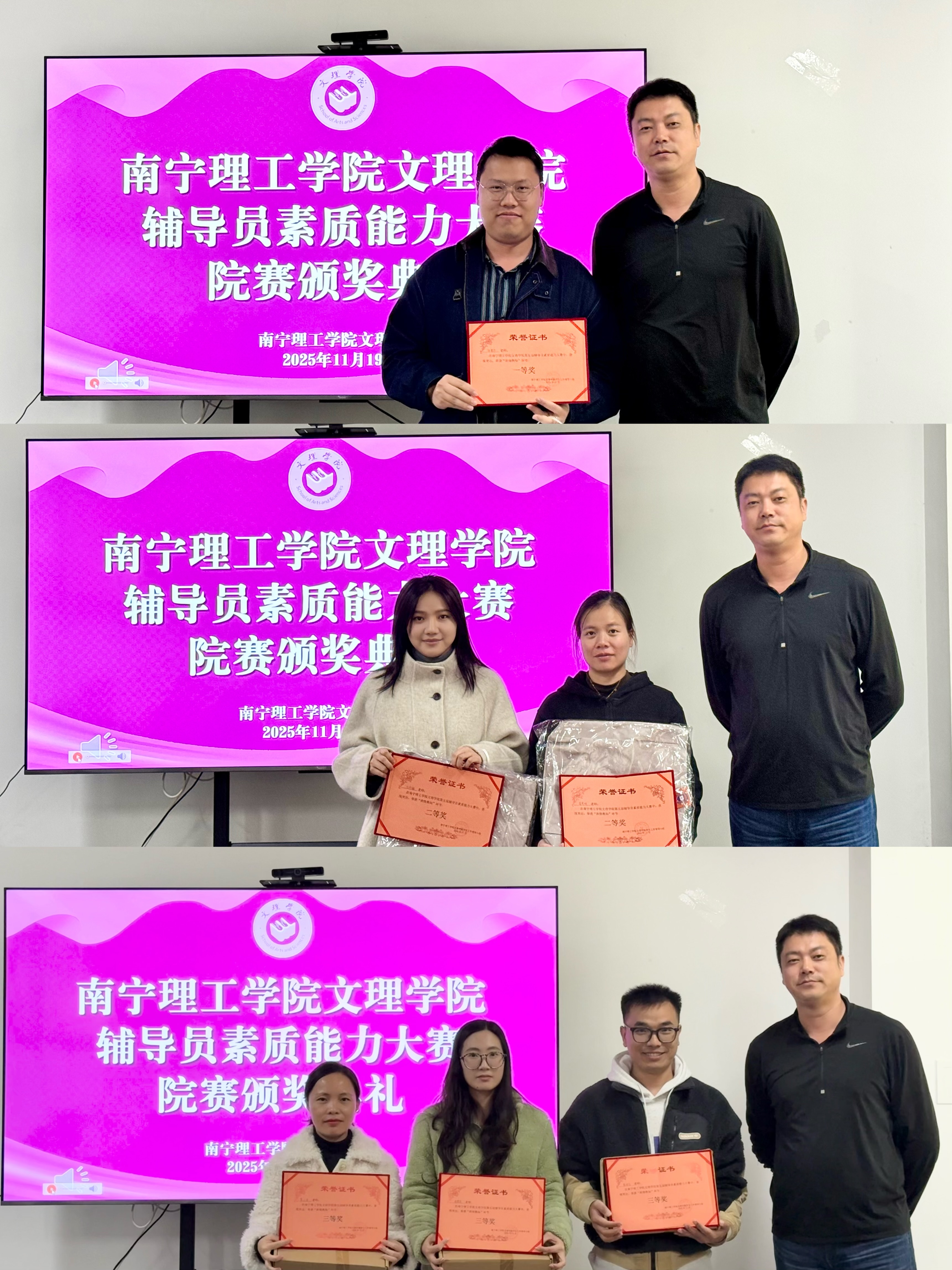 活动尾声,文理学院党总支书记孙宝会为获奖辅导员颁发荣誉证书与奖品。手中的奖牌既是对他们专业素养、育人初心的认可,也是对全体辅导员深耕学生工作、精进业务能力的激励。获奖辅导员们面带笑容、身姿挺拔,接过的不仅是一份荣誉,更是立德树人的责任与使命,现场掌声阵阵,传递着对辅导员队伍潜心育人、匠心筑梦的敬意,也凝聚起全院上下共同赋能学生成长、携手迈向教育新征程的奋进力量。