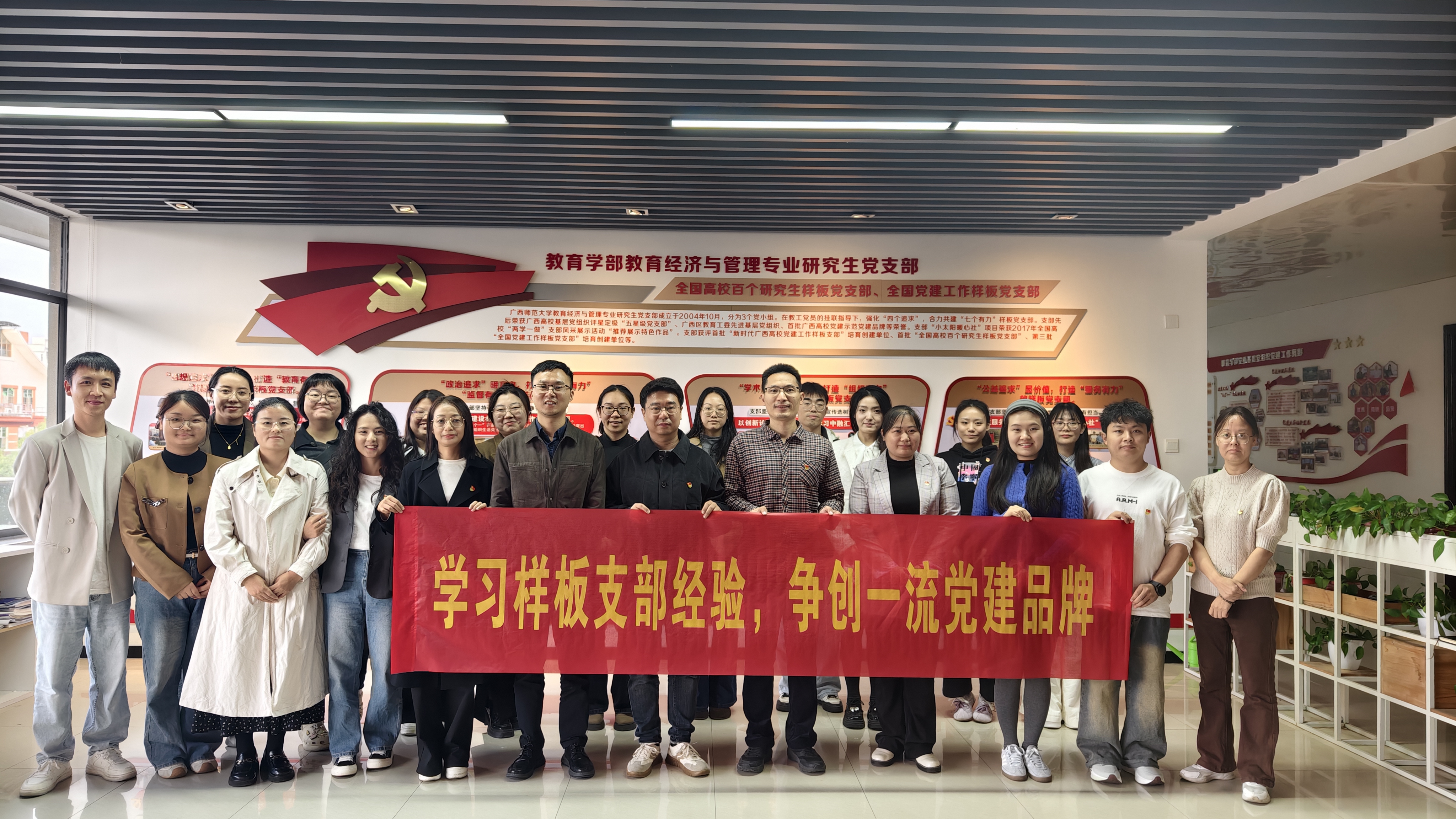为深入贯彻落实教育部新时代高校党建“双创”工作部署和学校党委工作要求,学习借鉴样板党支部建设先进经验,11月14日,我院党总支书记秦磊、副院长尹登科、分团委书记徐远菁同各师生党支部书记和党员代表一行赴广西师范大学教育学部开展样板党支部观摩交流活动。