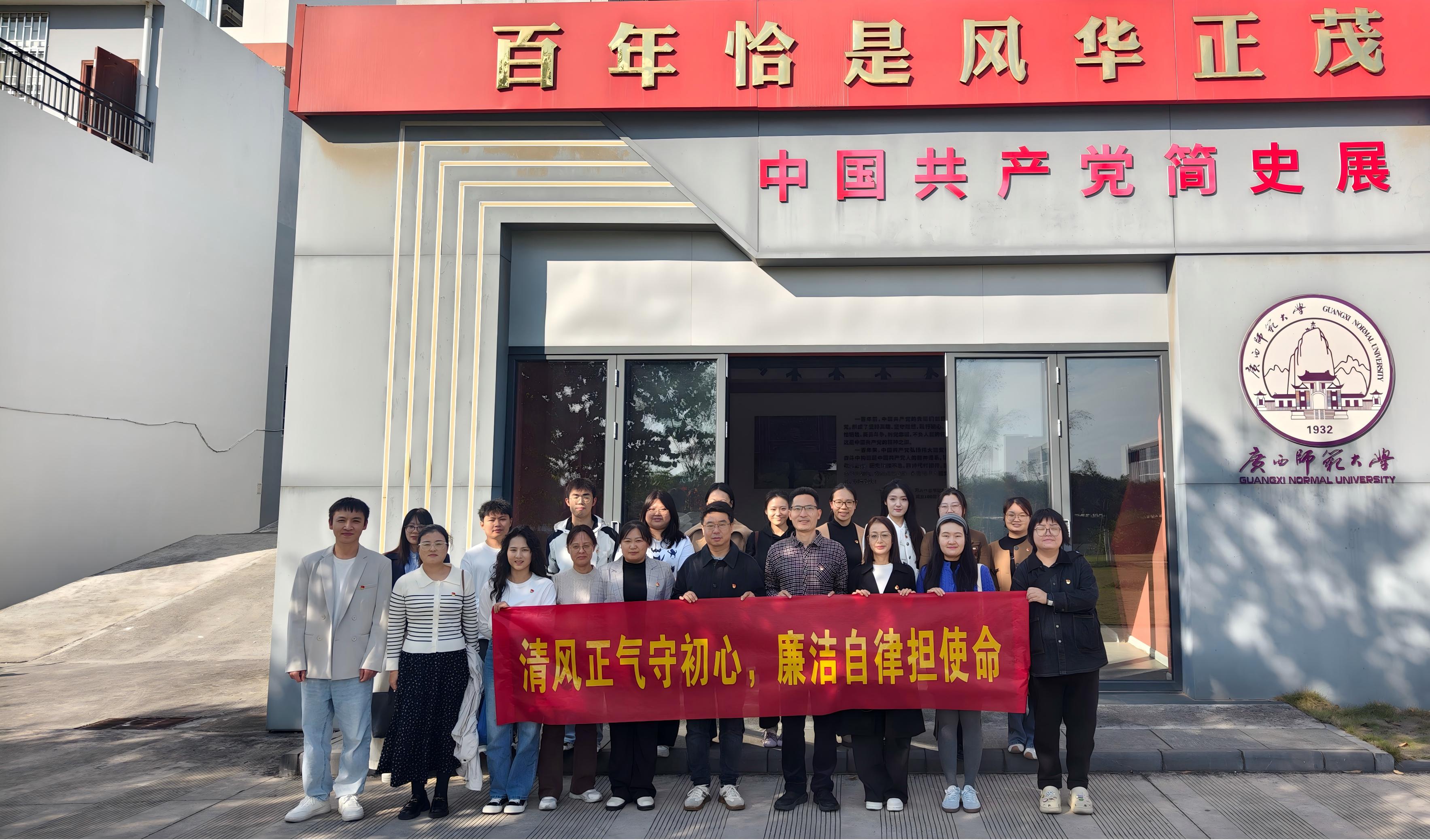 为深入学习贯彻习近平新时代中国特色社会主义思想,贯彻落实新时代全面从严治党要求,推进清廉学校建设向纵深发展,11月14日,学院党总支书记秦磊、副院长尹登科、分团委书记徐远菁同各师生党支部书记和党员代表一行,赴广西师范大学红色教育基地“中国共产党简史展”开展专题学习,汲取百年党史中的清廉力量。