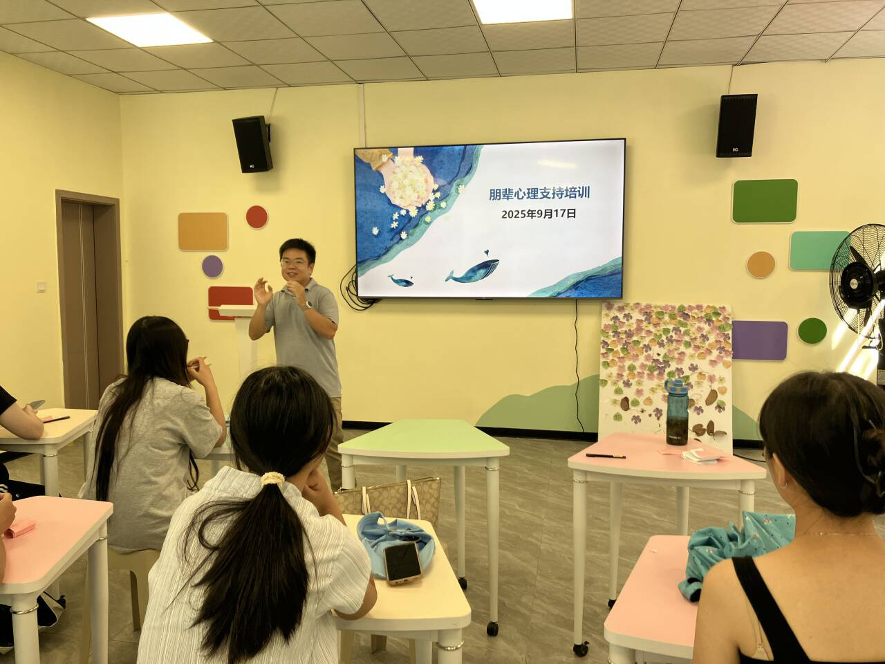 理论培训结束后,进入了更为关键的实践环节。学员们以班为单位,在指导老师的协助下,精心设计了一系列贴近学生实际需求的心理主题班会方案,内容涉及压力管理、情绪调节、人际交往、生涯规划等多个方面。随后,他们返回各自班级,正式作为“朋辈辅导员”主导开展心理班会。
