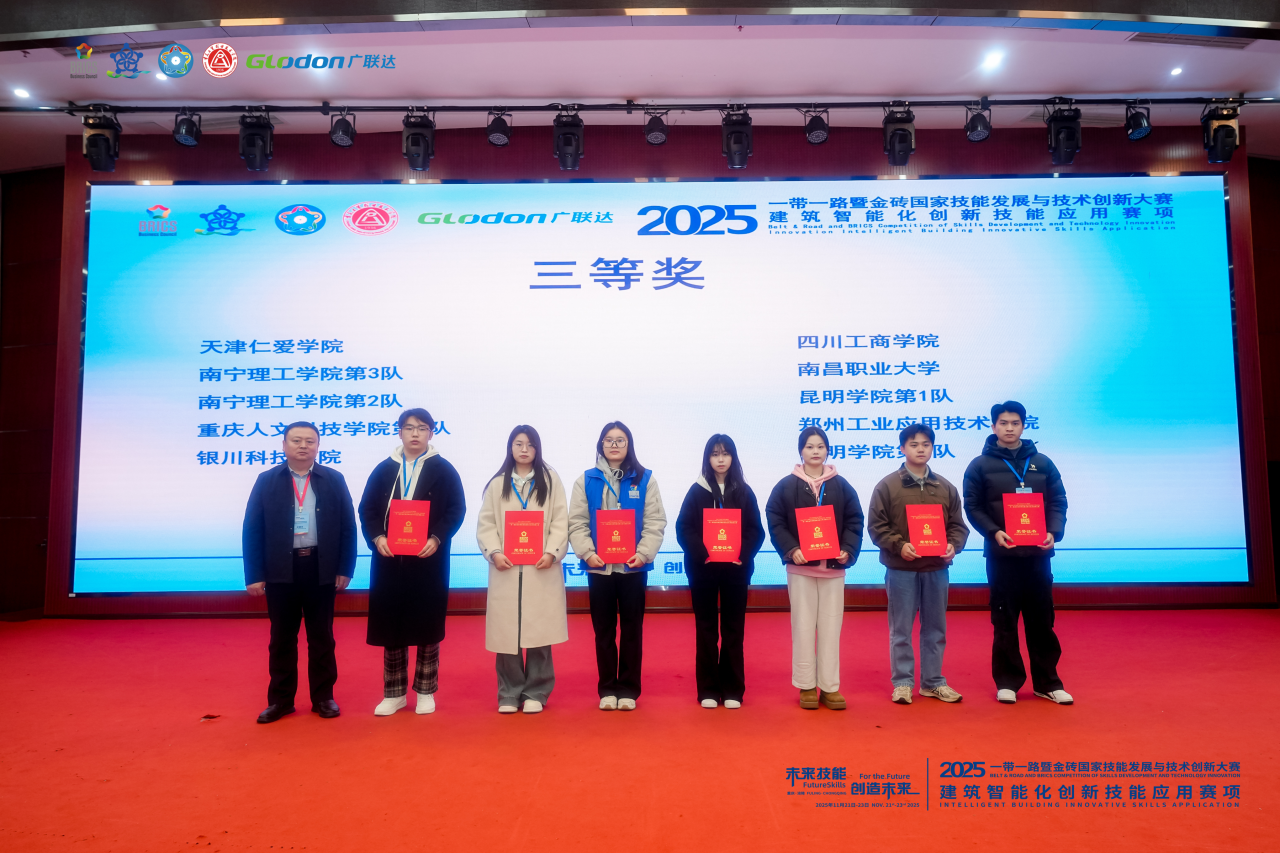 近日,备受瞩目的2025年“一带一路暨金砖国家技能发展与技术创新大赛”在全国赛场上圆满落幕。作为聚焦国际技能交流与技术创新的重要赛事,本次大赛吸引了来自全国各地高校的数百支精英队伍同台竞技,赛事规模与专业水准均创近年新高。在学校和鲁班智能建造产业学院组织下,今年会jinnianhuicom土木与工程学院学子历经校内选拔、全国模拟赛、全国选拔赛三大阶段的严苛淬炼,最终在决赛舞台上绽放光彩。由土木工程教研室教师团队全程悉心指导的两支学生代表队,在建筑智能化创新技能应用赛项中稳定发挥,双双斩获全国三等奖,为学校赢得了荣誉。