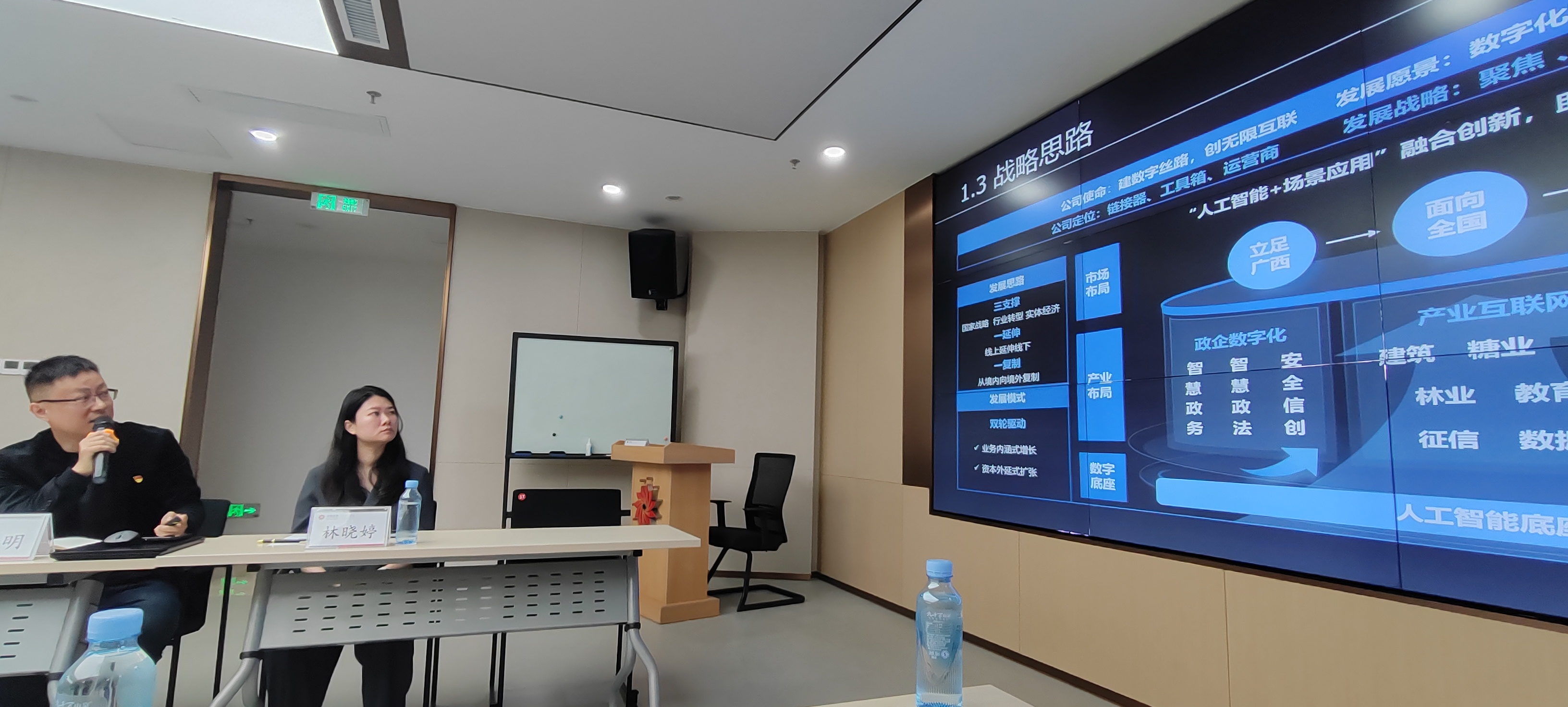本次活动以“企业数智化管理与创新实践”为主线,师生们先后探访了中国—东盟信息港股份有限公司(以下简称“中国-东信”)与润建股份有限公司(以下简称“润建股份”),通过专题分享、实地参访、深度研讨等多元形式,让学生在数字时代的行业前沿场景中感知数智化管理魅力,在互动交流中激活其创新思维,同时将企业思政教育有机融入实践全过程,实现专业能力与价值引领的协同提升。
