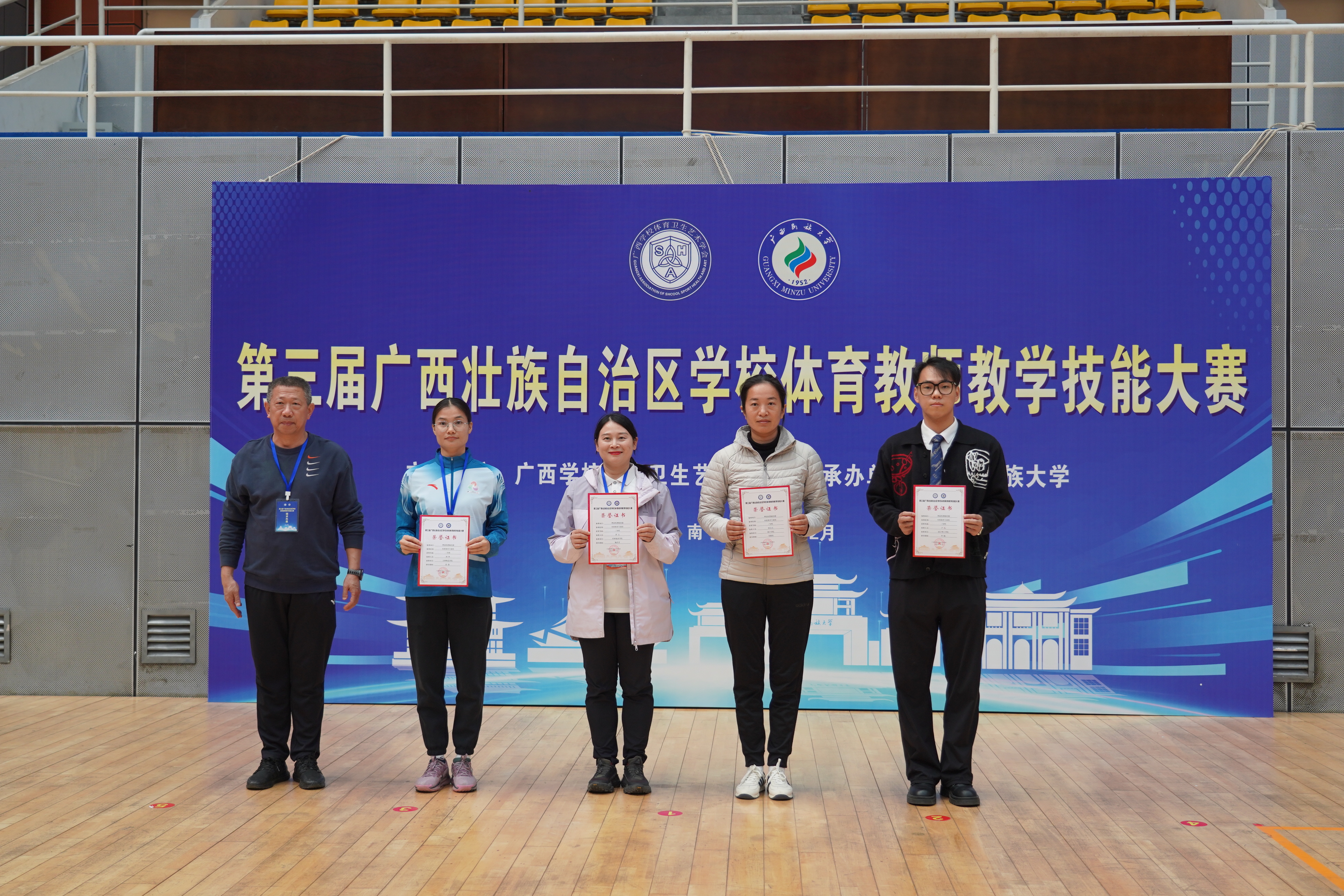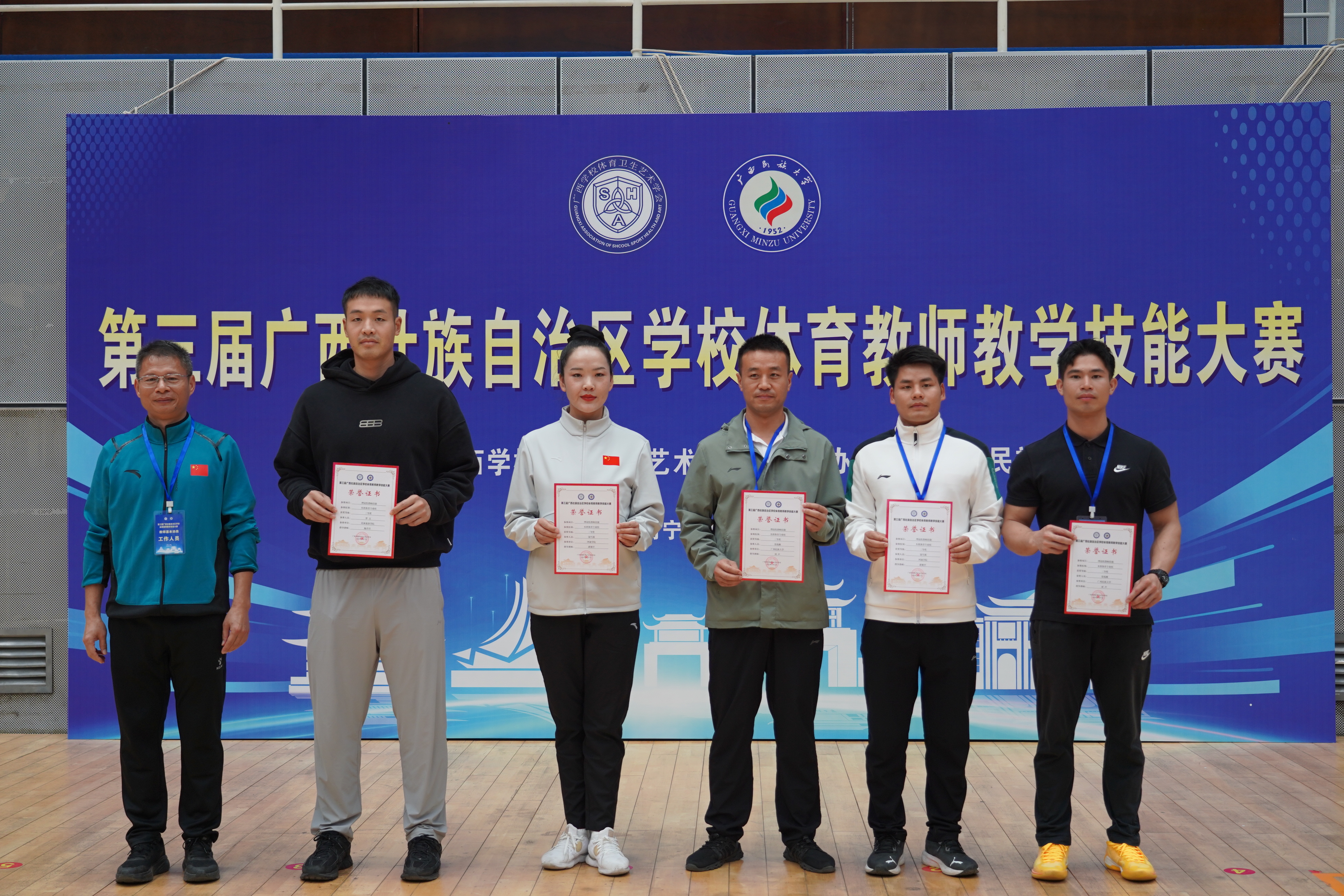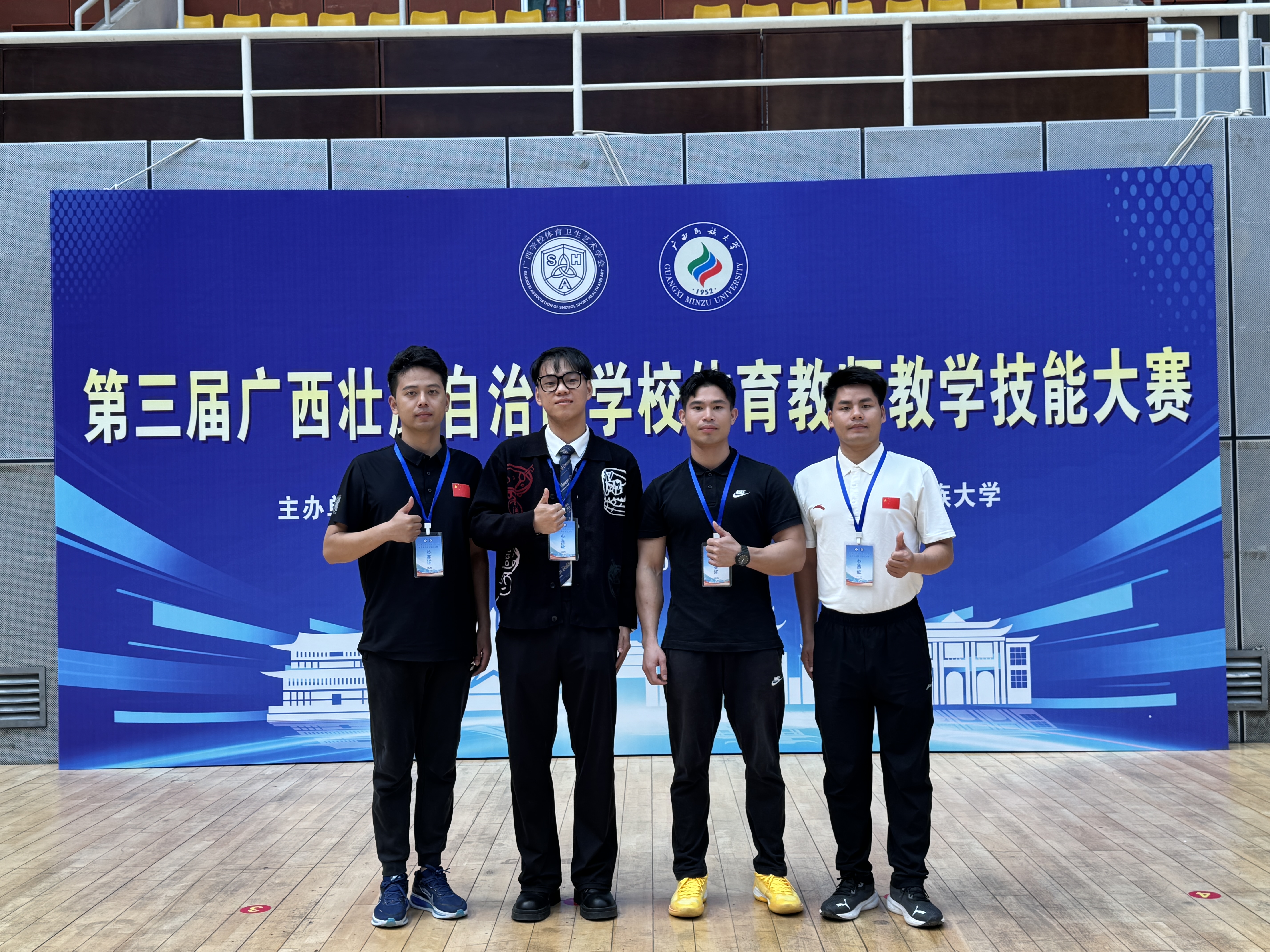 近日,由广西壮族自治区广西体育卫生艺术学会举办的第三届广西壮族自治区学校体育教师教学技能大赛圆满落幕。经过与来自全区各地市精英教师的激烈角逐,我校卢礼、黄富朋、黄自源老师凭借扎实的专业功底、精湛的教学技能和出色的现场表现,最终脱颖而出,卢礼老师荣获理论组本科组体育专业组三等奖。黄富朋老师荣获术科组体育专业组教师技能三等奖、术科基本功三等奖、术科综合技能三等奖。黄自源老师荣获术科组体育专业组教师技能三等奖、术科基本功三等奖、术科综合技能三等奖。充分展示了我校体育教师卓越的风采与雄厚的教学实力。