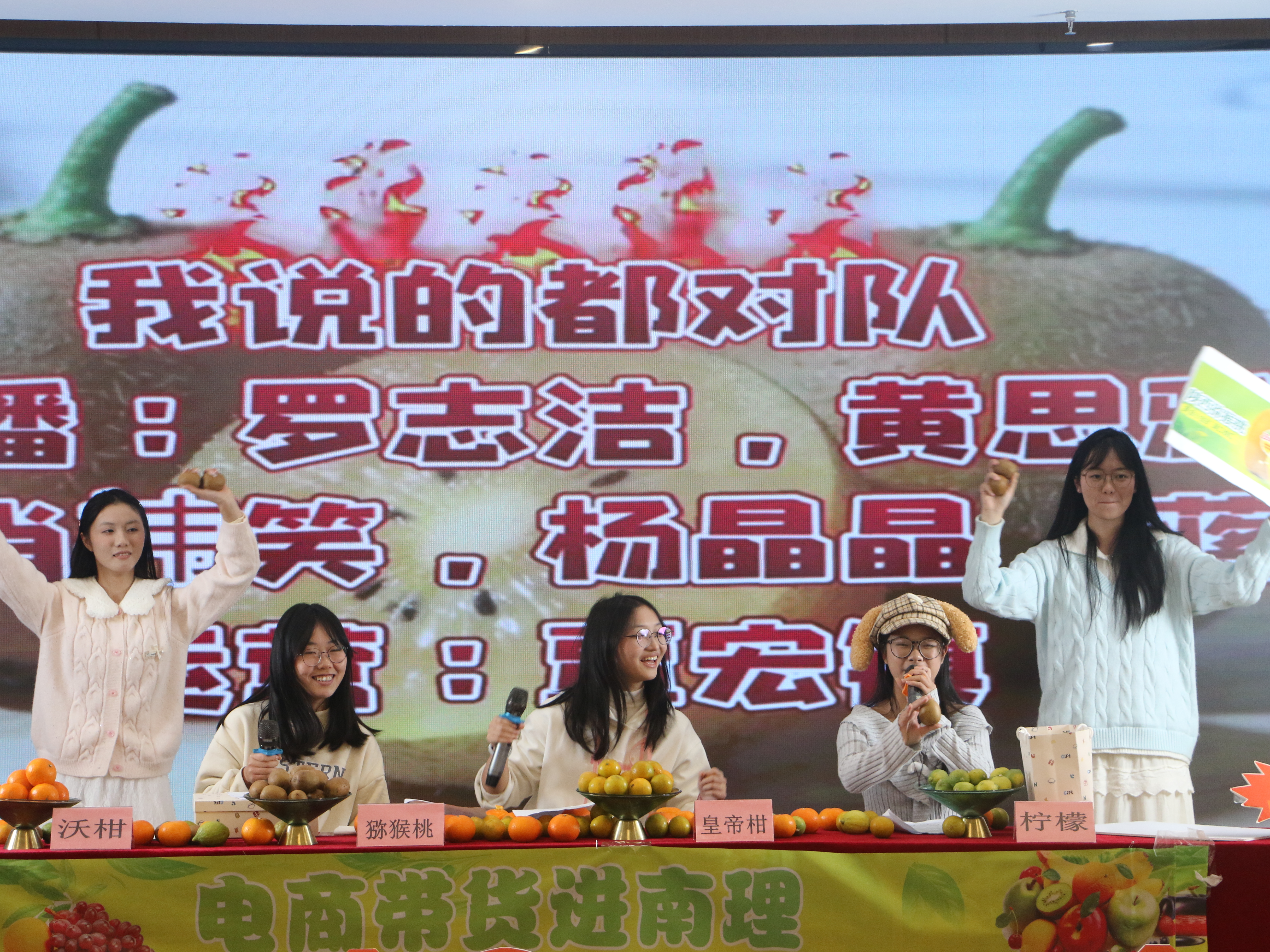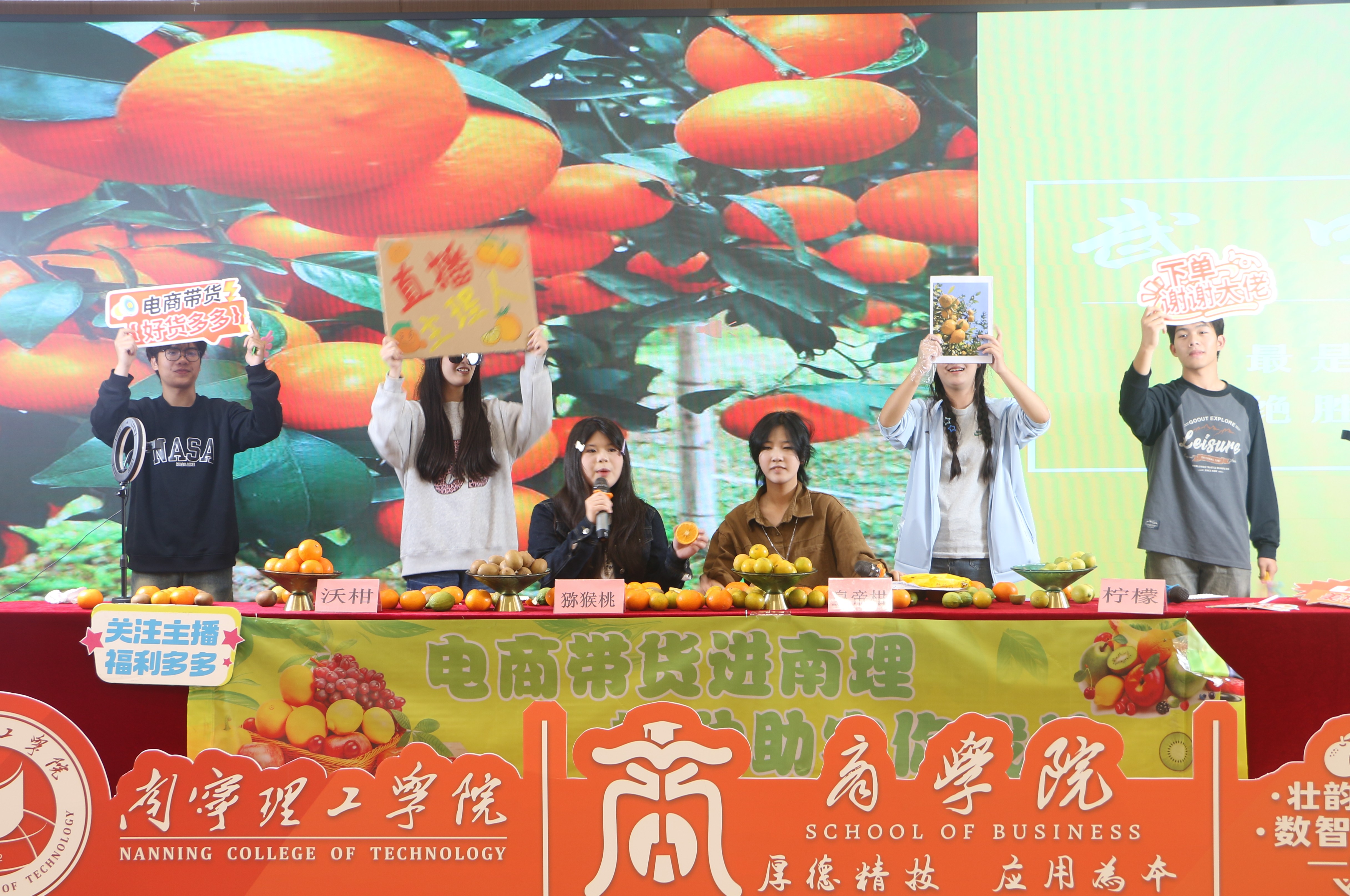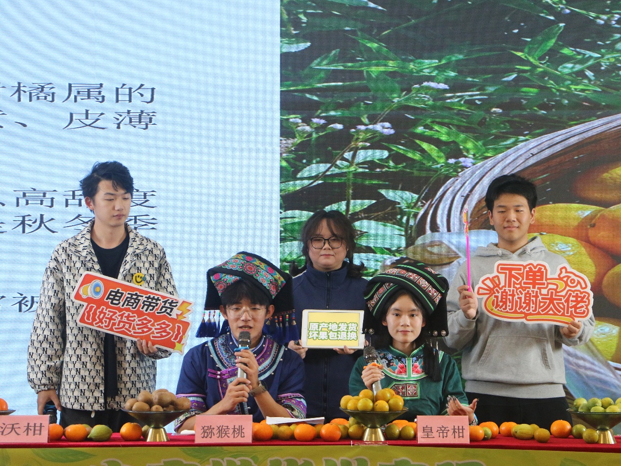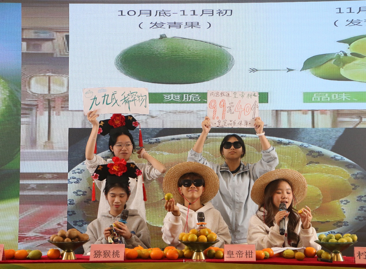 比赛现场,各参赛团队充分发挥专业优势,将商科知识与助农热情巧妙融入直播演绎,呈现出一场场创意十足、亮点纷呈的直播展示。有的身着色彩艳丽的壮族服饰,以浓郁的民族风情为切入点,生动讲述沃柑背后的种植故事与地域文化,让观众在了解产品的同时,感受广西独特的民族魅力;有的创新打造“宫廷”人设,通过趣味互动话术与场景化演绎,将皇帝柑的品质优势与“宫廷贡品”设定结合,有效带动全场气氛;还有的凭借扎实数据分析能力,通过精准市场数据、果品营养对比等信息,直观呈现农产品核心优势,展现商科学生的严谨逻辑与专业素养。