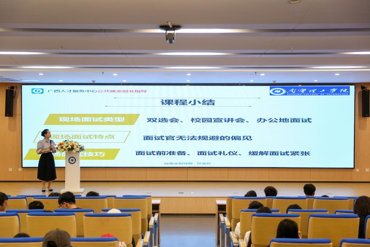 贝宝珍老师作为本次讲座主讲嘉宾,深耕人力资源领域十余年,曾担任广西公共频道《挑战技能王》第一季市场营销专业面试官,并曾在上市集团公司主导校园招聘及管培生培养工作,对企业用人标准与招聘全流程具有深刻洞见。讲座中,贝老师结合自身经验,以“理论+案例+模拟”的形式,围绕现场面试类型、特点及应对技巧展开深度解析。