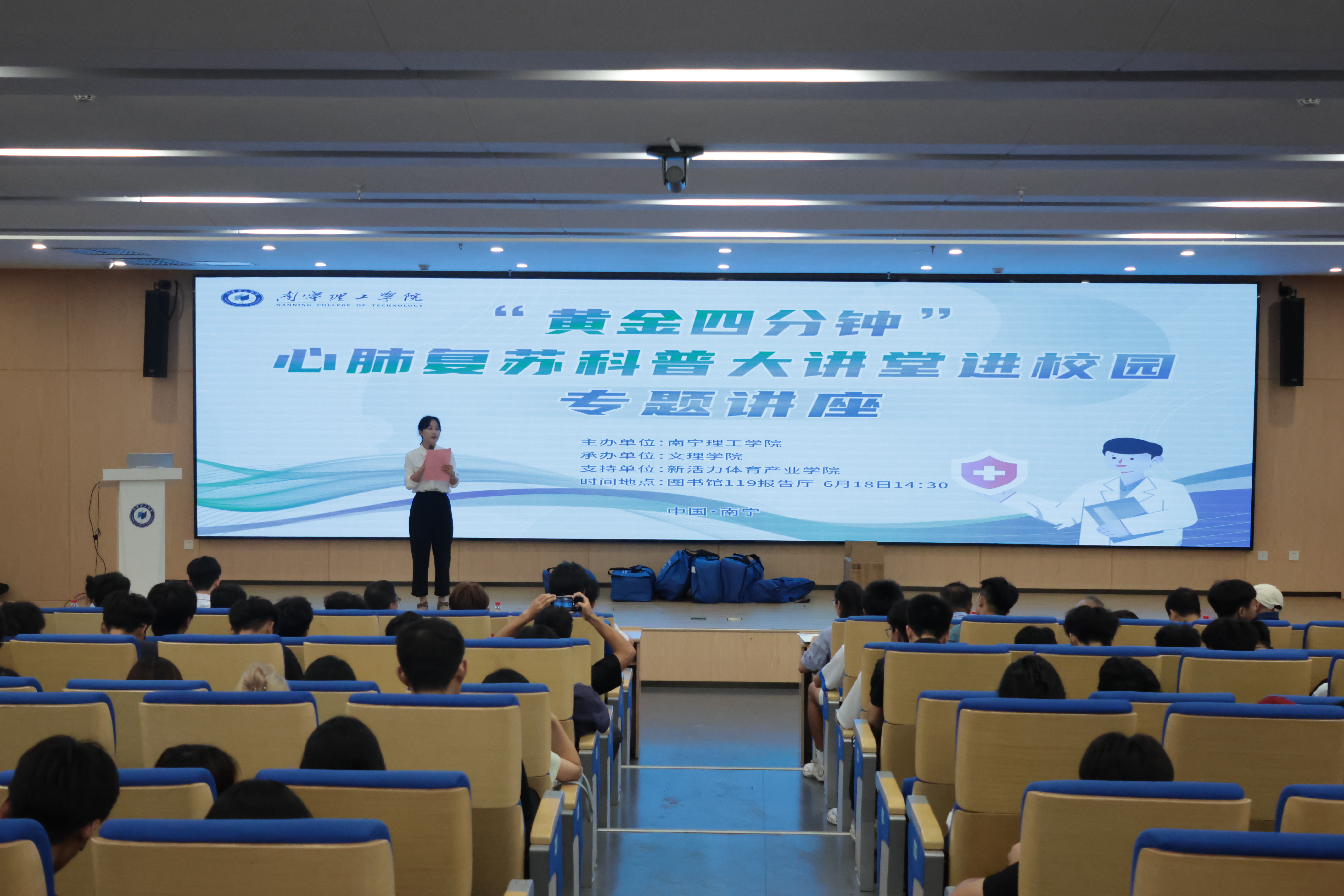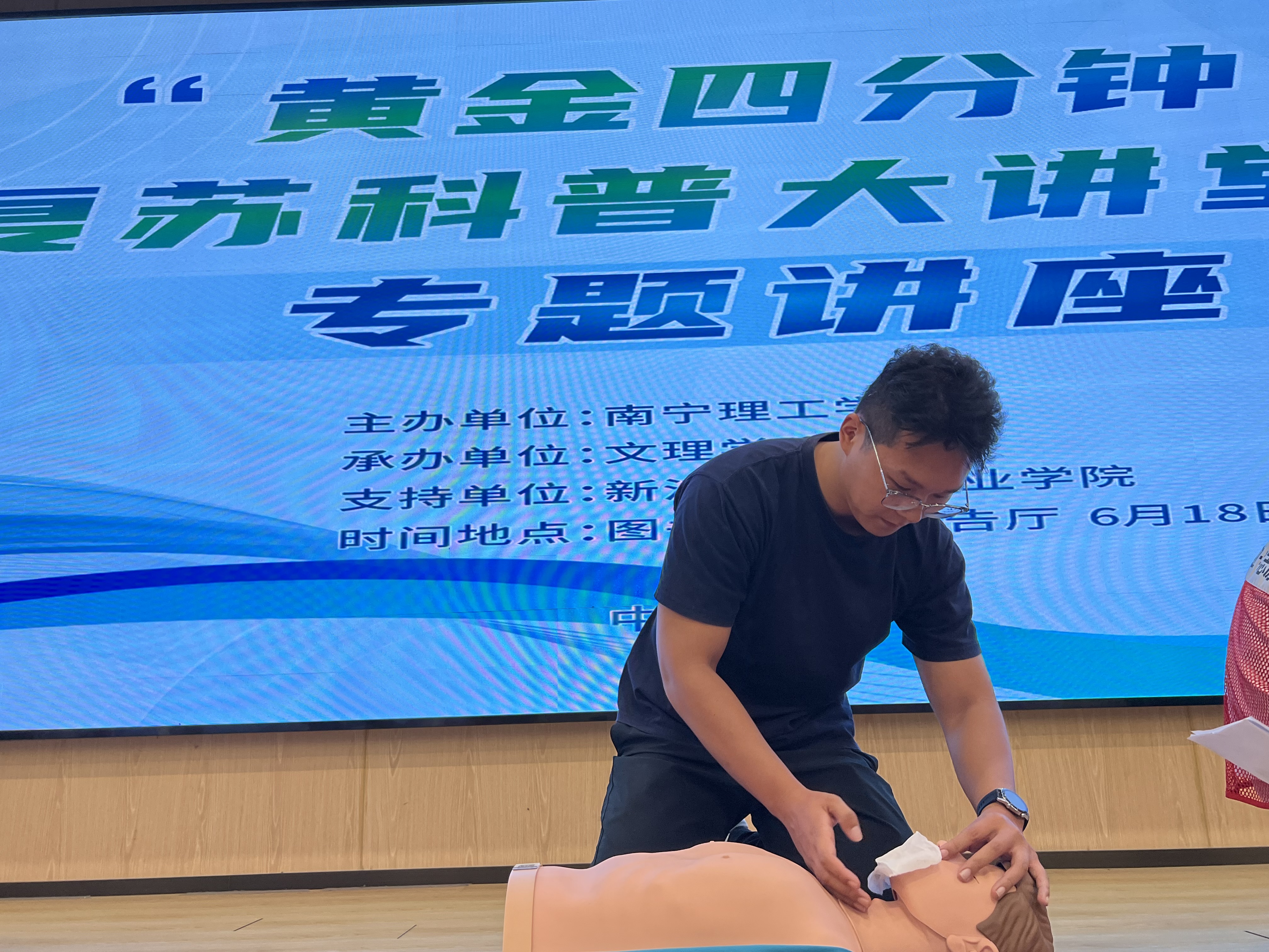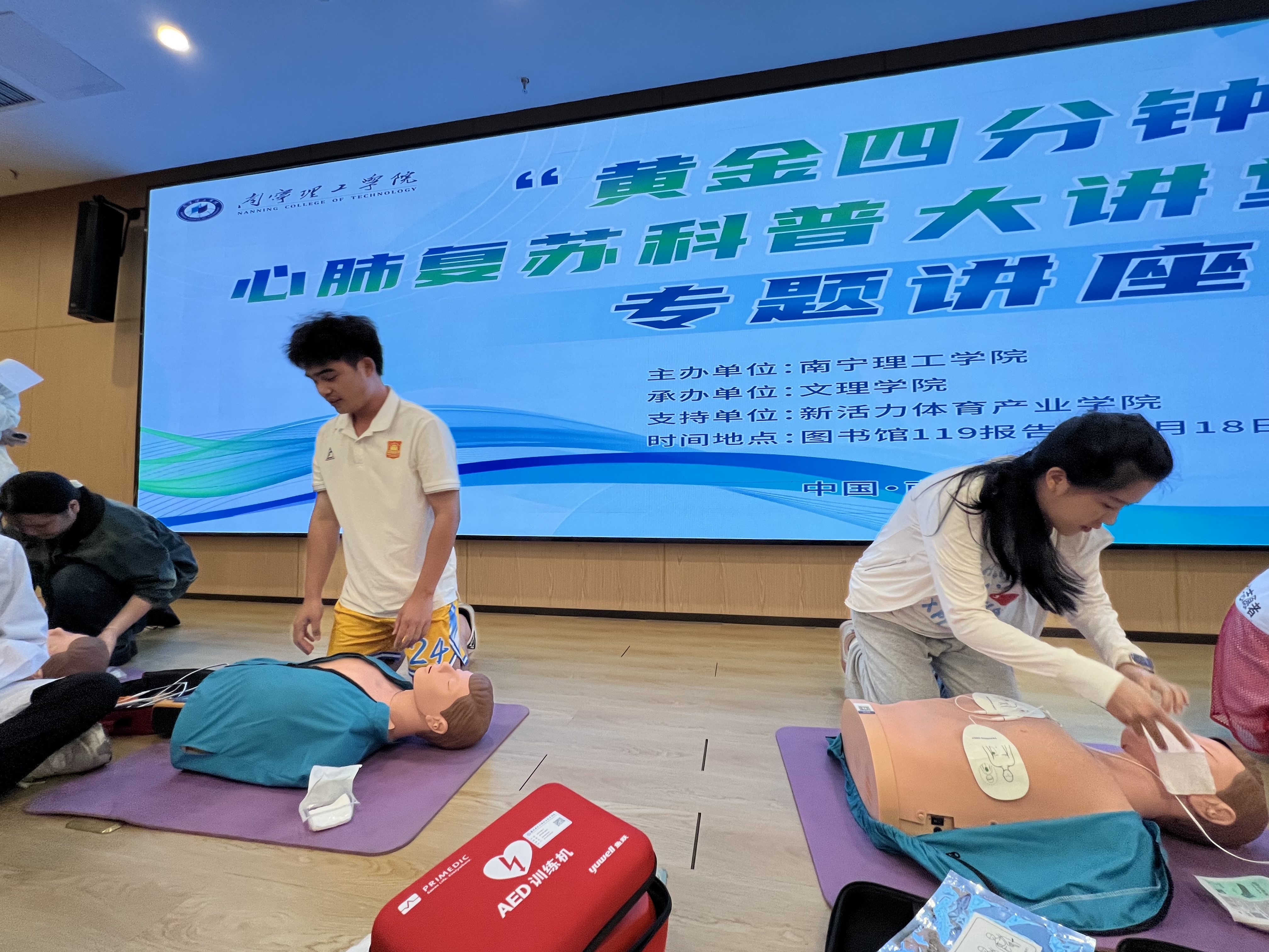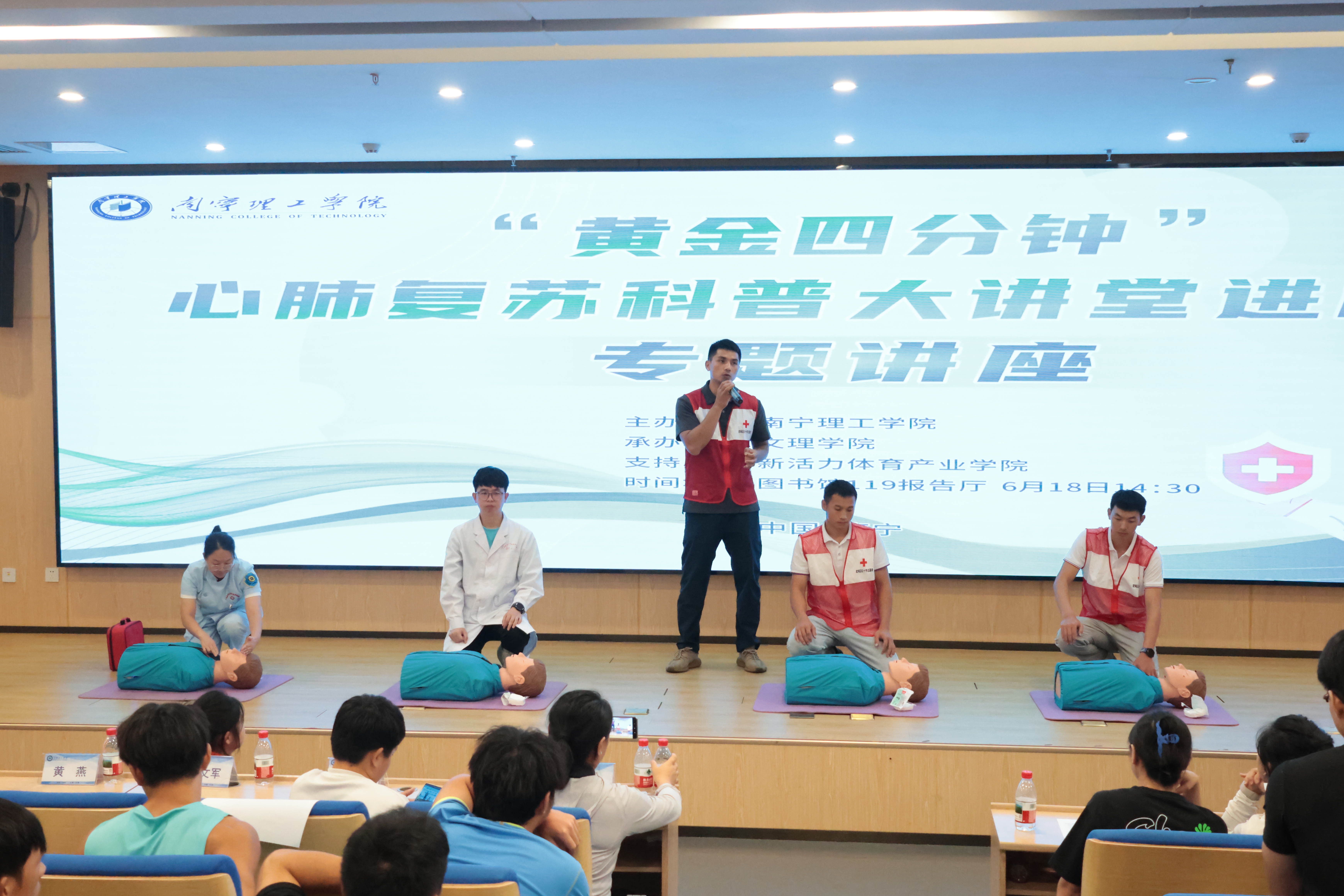 为推进学校突发事件应急体系的建设,普及应急救护知识,让师生学习掌握急救操作技能,提高安全防范意识,增强师生自救互救能力和应对突发事件的处置能力,6月18日下午在南宁东盟校区图书馆报告厅组织开展“黄金四分钟”心肺复苏科普大讲堂,全体体育教师、社会体育指导与管理专业学生代表、青年志愿者协会学生代表、校红十字会学生代表的260余名师生参加此次学习。讲座由体育专业教研室邓雨婷老师主持。本次活动由新活动体育产业学院大力支持。