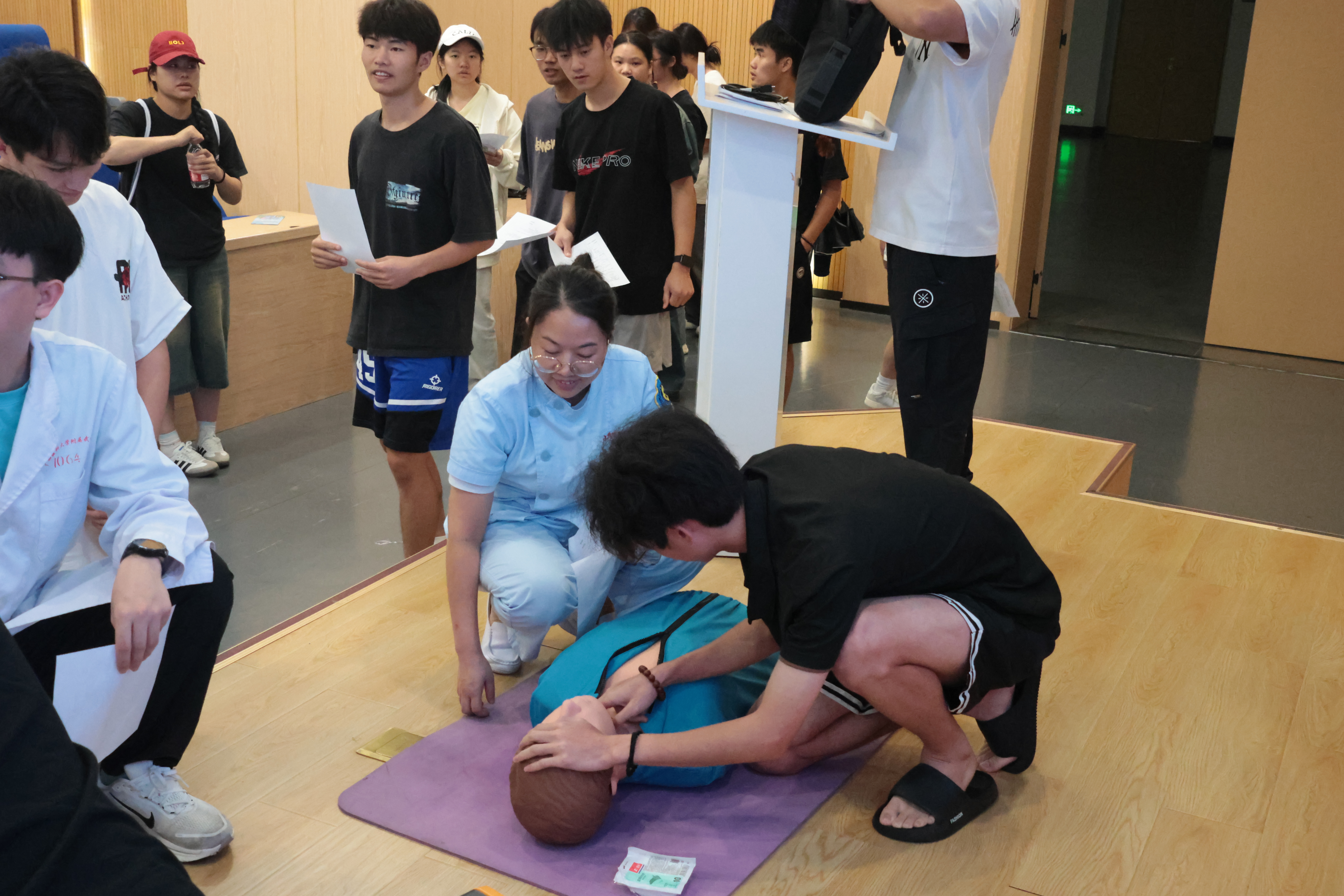 师生们分组模拟演练,从判断患者意识、呼救、胸外按压到使用AED,每一步都严格按照标准操作。李老师和助教团队逐一指导,纠正同学的错误动作,帮助熟练掌握急救技能。