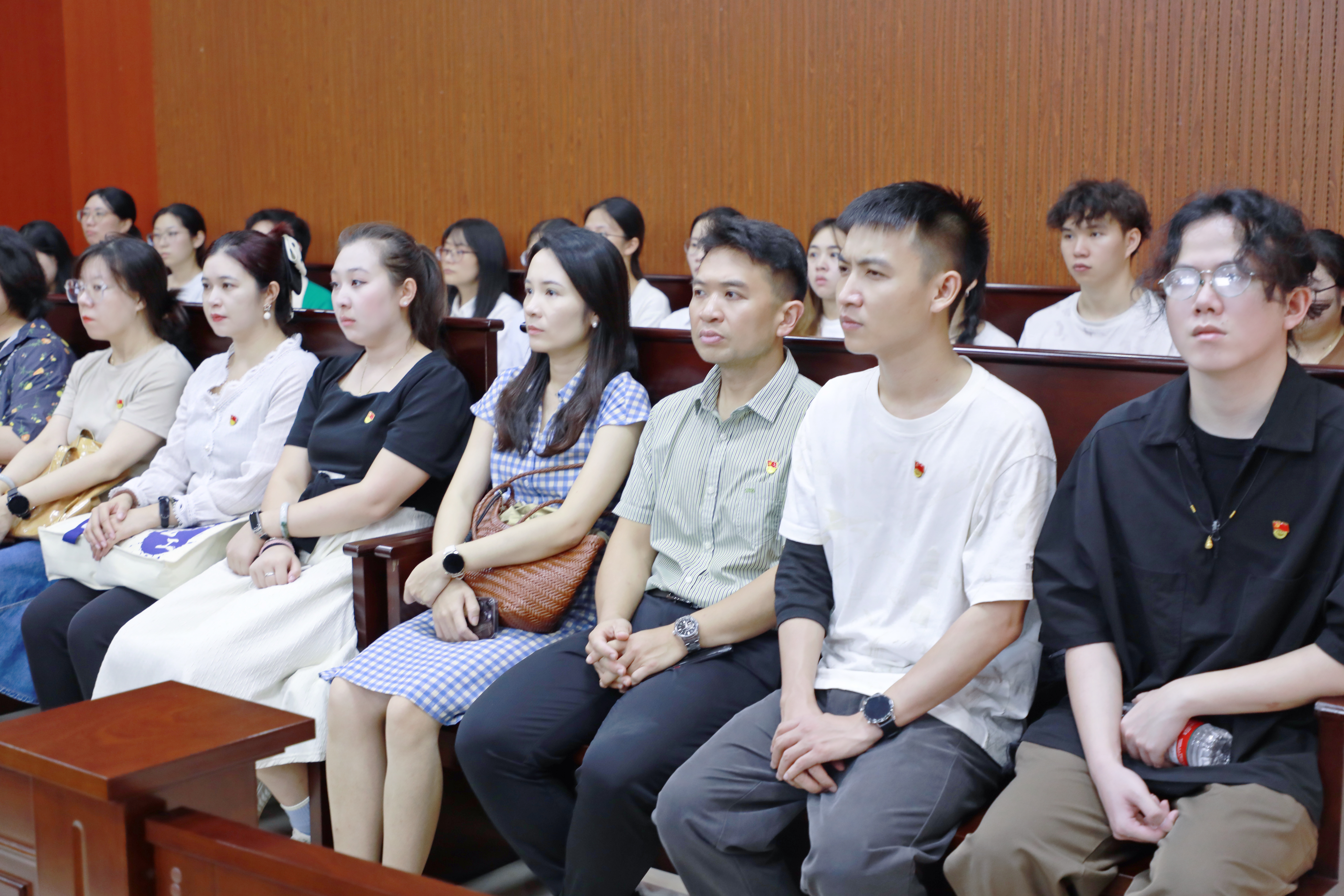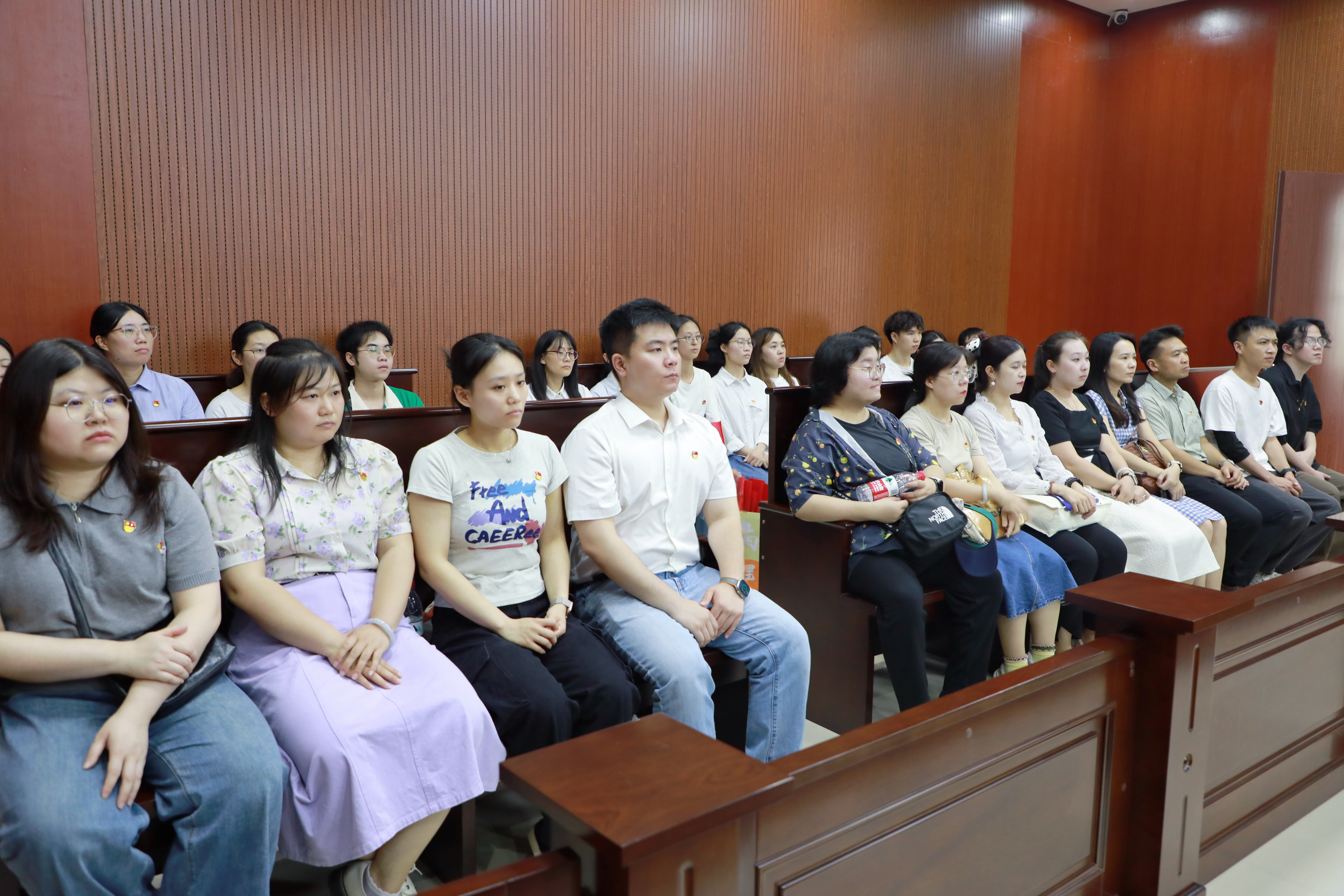 随后,在法院工作人员的有序引领下,师生们步入审判庭就座,现场观摩了桂林市某机动车交通事故责任纠纷一案的庭审过程。庭审中,法官严格依照庭前准备、法庭调查、举证质证、法庭辩论等法定程序,有条不紊地推进庭审进程。整个庭审过程规范严谨、庄严肃穆,为师生们呈现了一堂极具教育意义的司法实践课,使大家切实领略到法律程序的公正性与严肃性,深刻认识到法律在维护社会公平正义中的关键作用。