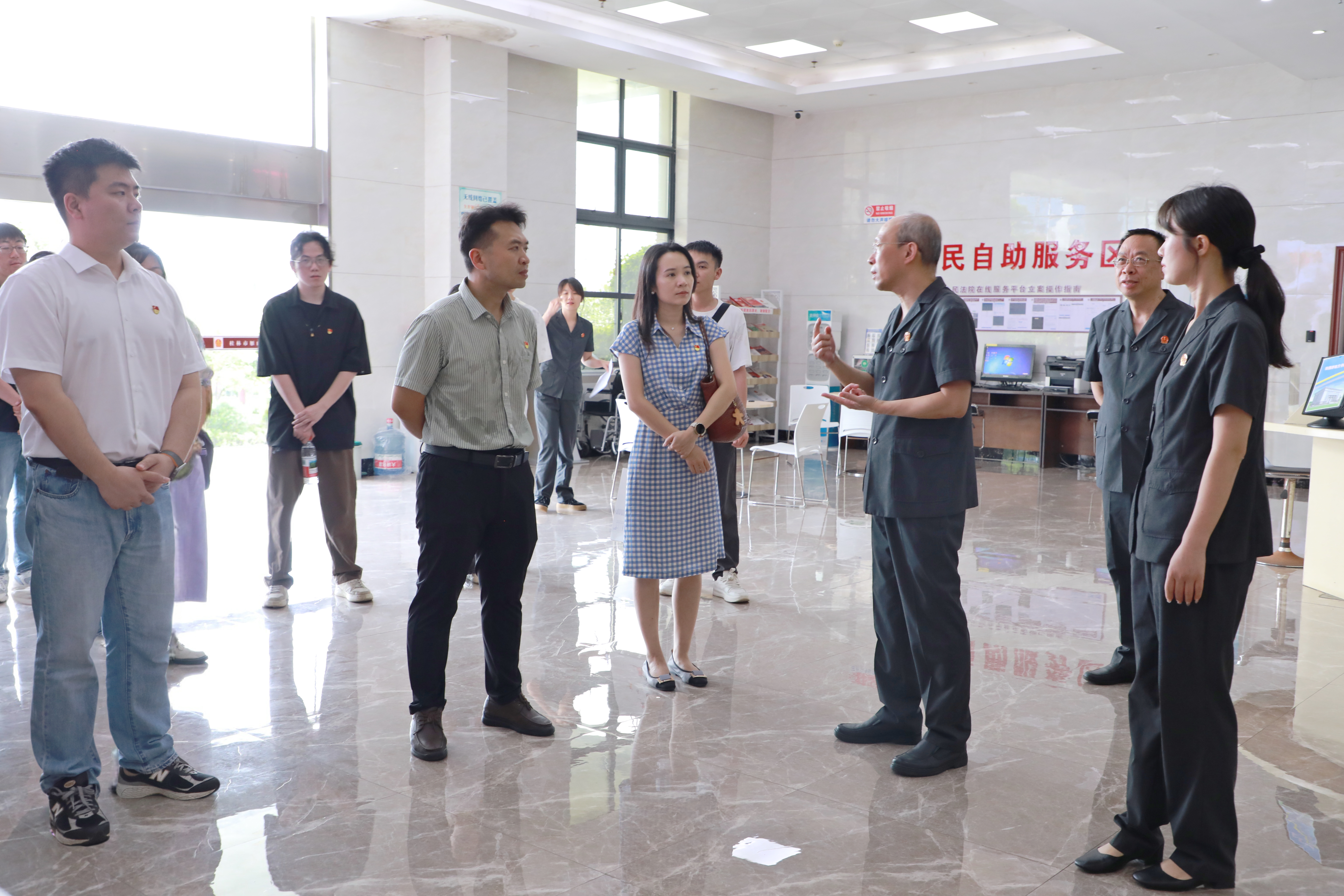 活动伊始,法院工作人员有条不紊地引导师生参观诉讼服务大厅。桂林市雁山区人民法院党组书记、院长苏革亲临现场,深入讲解。从法院的职能定位、机构设置等基础情况入手,细致阐述了诉讼服务大厅 “一站式” 诉讼服务体系的运行机制。通过其专业解读,师生们真切感受到司法为民理念在诉讼服务全流程中的生动呈现,深刻领会到司法便民、利民、为民的价值追求。