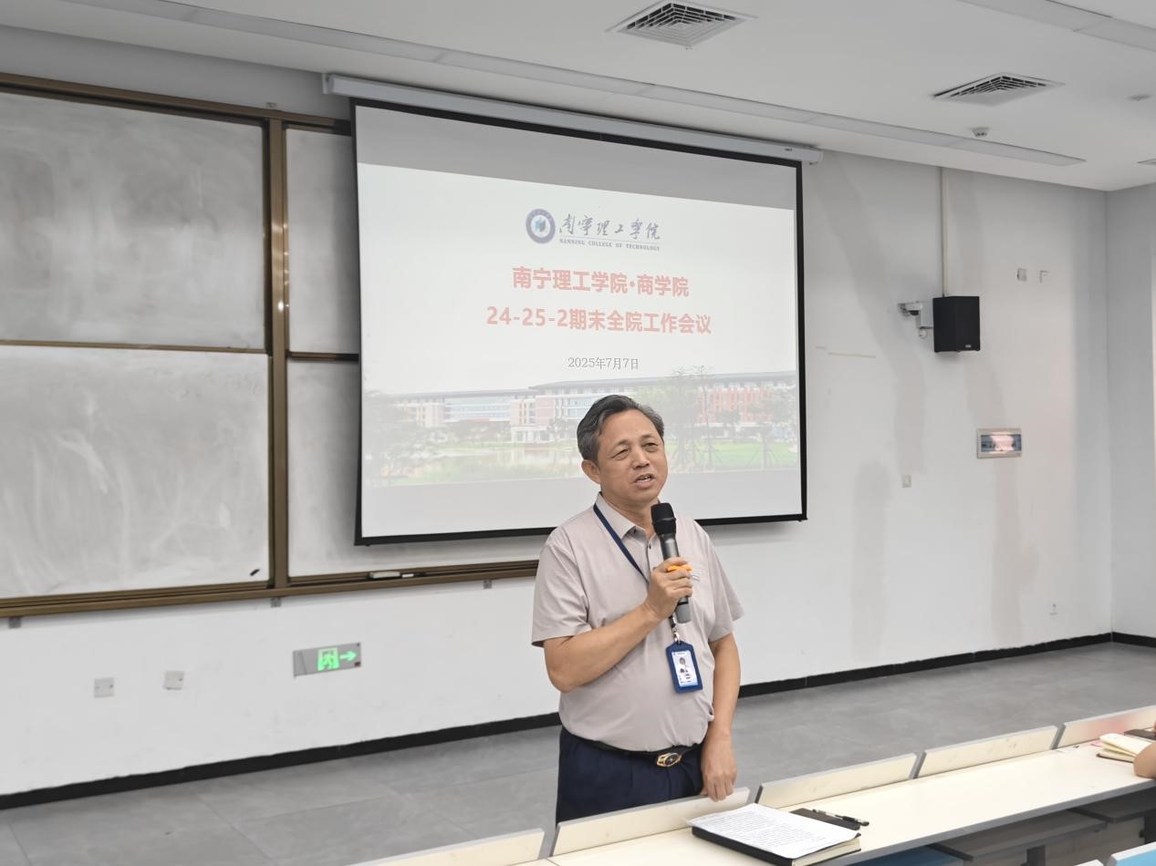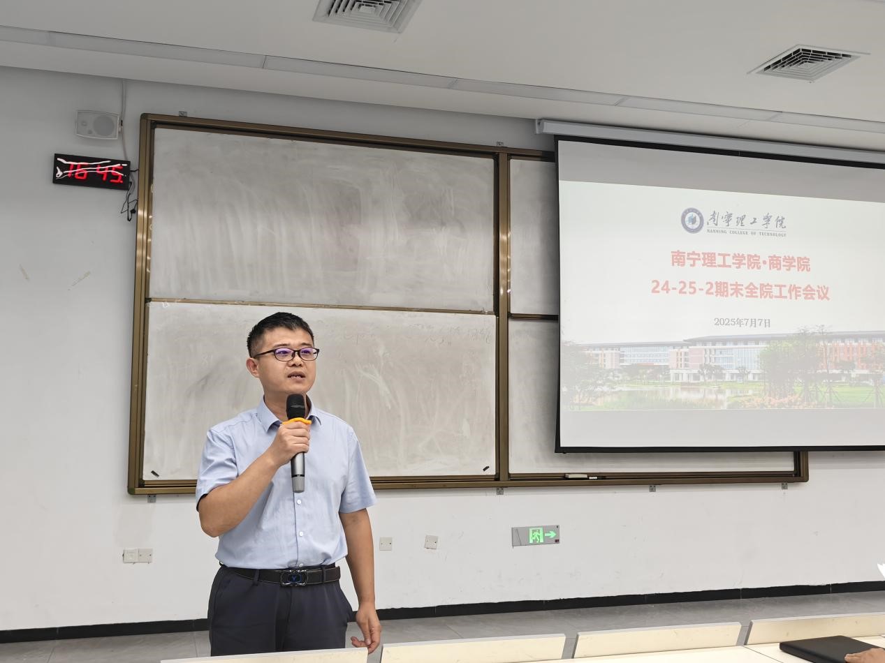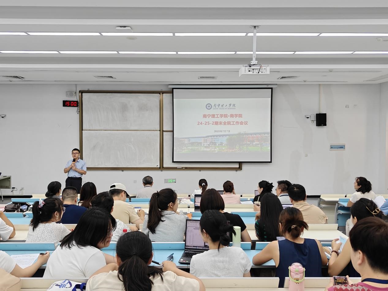 2025年7月7日,商学院春季学期末教职工全体大会在A3101举行,大会由囤荣立院长主持,姚瑞基院长、姚顺良书记分别就各自分管领域的工作进行了总结发言。
