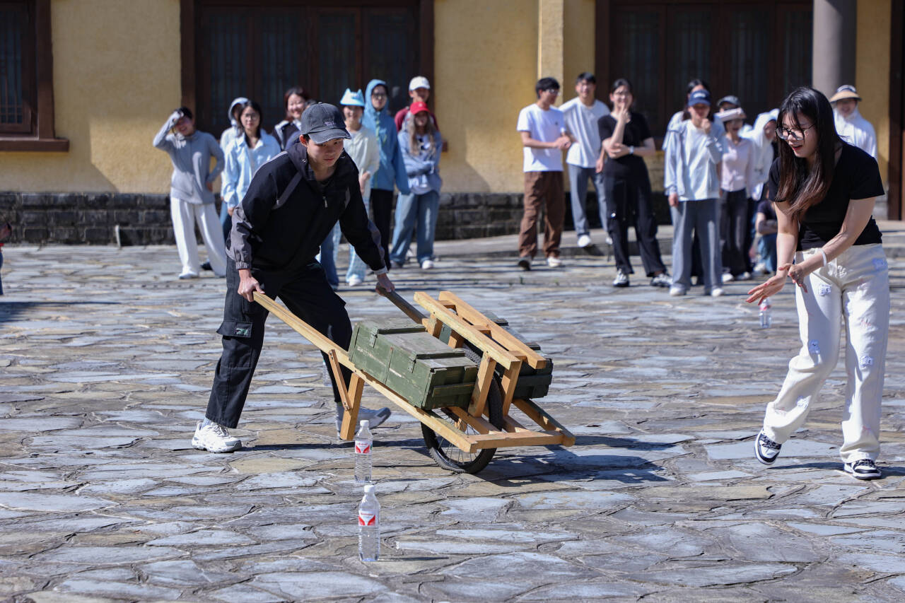 在红军古道景区甫茶屯,同学们参与了一场别开生面的“红色运动会”。通过“淮海独轮车”、“抗战担架队”等团队竞技项目,在协作中磨炼意志,感悟革命年代的艰辛与团结精神。随后,学员们重走红军路,从甫茶屯徒步至水陇会议遗址,亲身体验红军长征的艰苦历程。走进天琴壮寨,同学们学习非遗壮锦技艺,聆听壮族文化故事,并在织娘的指导下亲手制作壮锦香包,感受了传统文化的魅力与工匠精神。