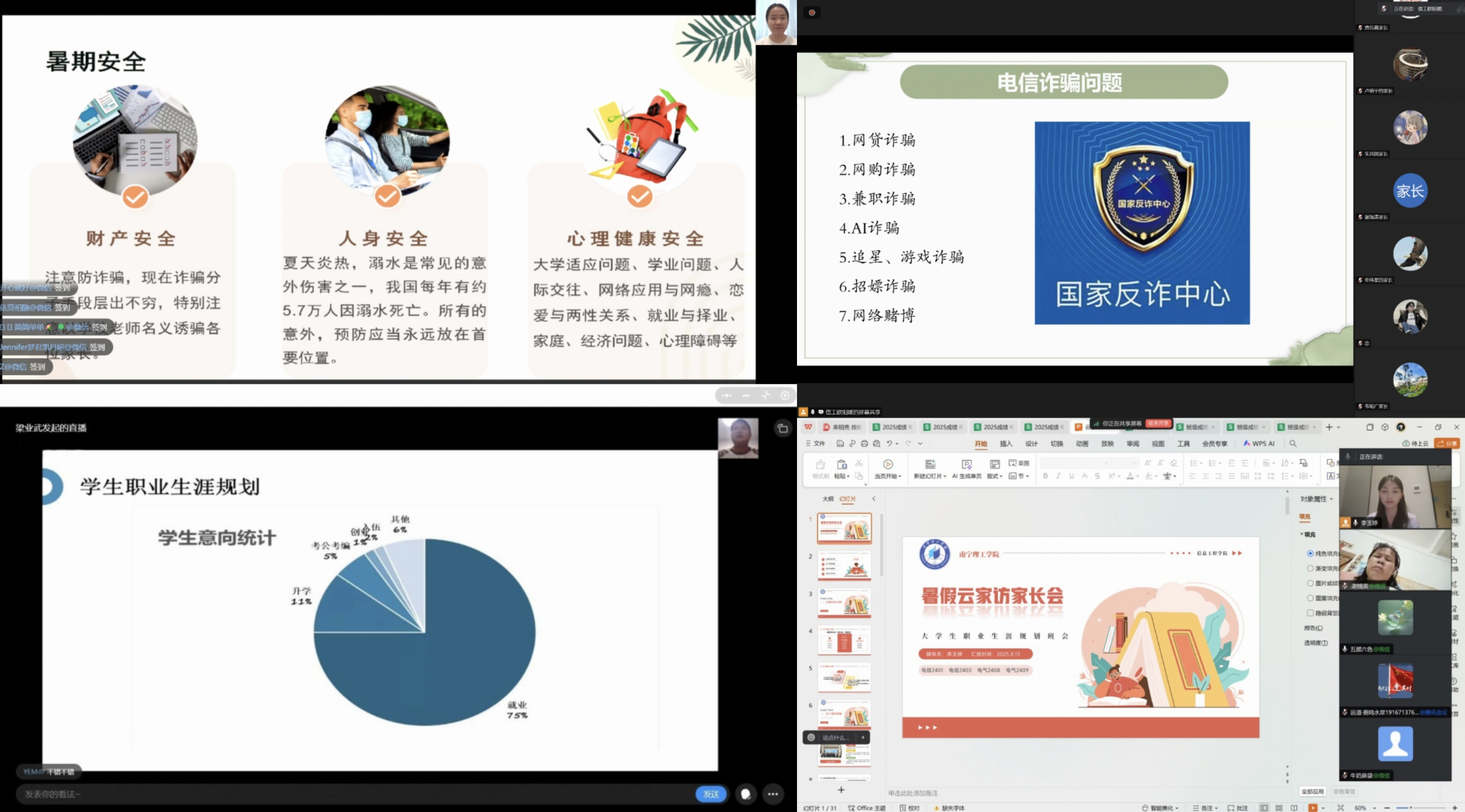 本次“云·家访”坚持高位推动、系统谋划,各二级学院辅导员以高度的政治责任感和强烈的时代使命感,依托微信视频、腾讯会议、钉钉等多元数字平台,围绕思想引领、心理护航、学业导航、职业规划、安全教育、反诈防骗等主题,开展“键对键”“屏对屏”的深度对话。活动突出精准滴灌、分类施策,既有云端家长会的大格局,也有点对点私聊的小温暖;既有方向性的宏观指导,也有个性化的微观关怀,充分体现了“以生为本”的工作理念和“时时放心不下”的责任担当。