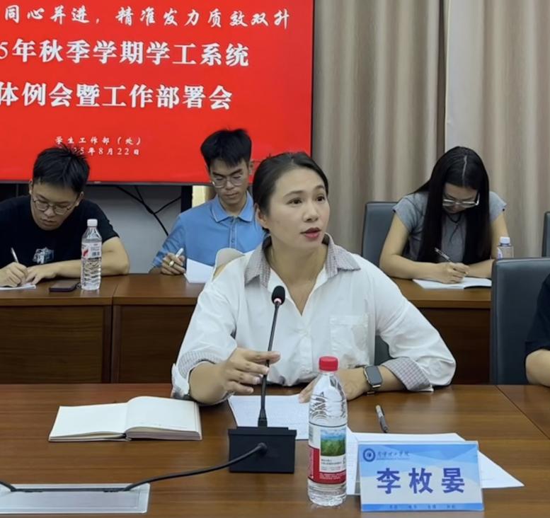 会上,李枚晏部(处)长聚焦当前阶段核心任务,就意识形态阵地建设、校园安全稳定保障、新生报到服务保障、入学教育体系构建、新生研学活动组织、优良学风培育、校园文明行为规范养成、辅导员专业队伍建设及国际化育人平台搭建等重点工作,进行了系统且详尽的部署,同时清晰明确了下一阶段的具体工作方向、实施步骤与责任要求,进一步压实工作责任、细化落实举措。她指出,学工系统全体成员要坚持落实“立德树人”根本任务,牢固树立校园安全稳定底线思维,以高质量思政教育引领高质量育人工作,以国际化为导向,明确工作重点,以品质化为目标,做好内涵提升,为学校高速发展提供强有力的保障与支撑。她强调,要继续探索学生工作的实施内容、载体和方法,明确目标,细化措施,确保各项工作落到实处,凝心聚力,开拓创新,共同书写新学期的育人答卷。