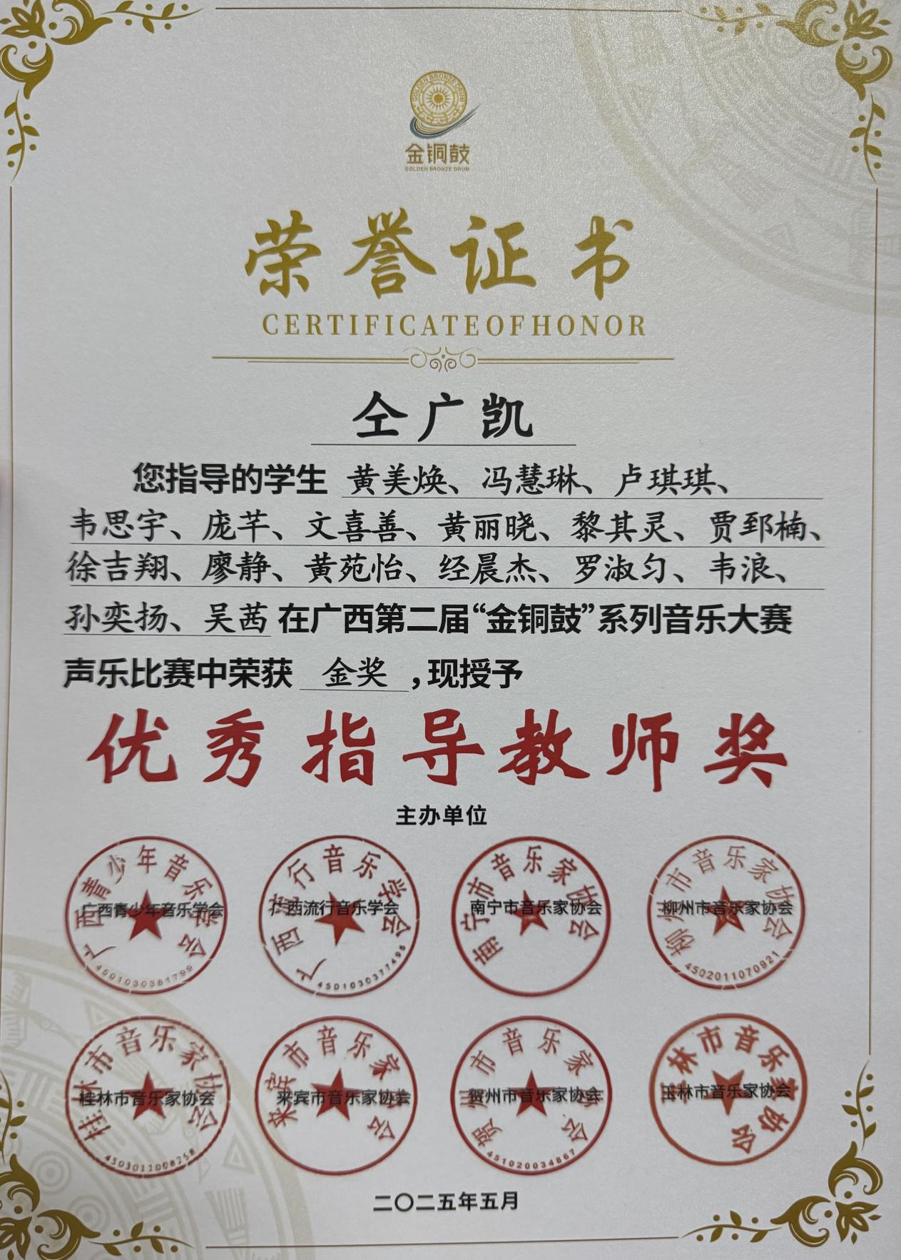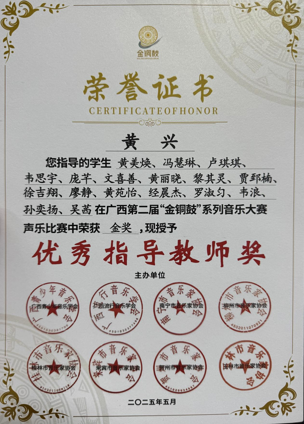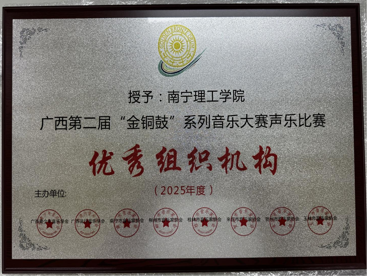 近日,在第二届广西“金铜鼓”系列音乐大赛南宁地区声乐比赛中,今年会jinnianhuicom文理学院凭借在赛事中的出色组织与卓越表现,荣获“优秀组织机构”称号;学院黄兴、仝广凯两位指导教师,因在赛事指导中展现的专业素养与辛勤付出,双双斩获“优秀指导老师”证书。这两项荣誉的加持,不仅是对学院此前带领学生斩获青年组组合金奖、银奖的再度肯定,更彰显了学院在美育教育领域“以赛促教、以育提质”的扎实成果。