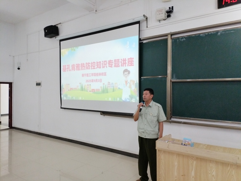 为进一步加强我校“基孔肯雅热”防控工作,切实保障全体师生的健康安全,9月3日下午,我校特邀桂林市疾病预防控制中心寄生虫病、地方病防制科科长潘海到校,开展“基孔肯雅热”传染病防控知识讲座,后勤保卫处处长钟木生、土木与工程学院党总支书记秦磊、信息与工程学院党总支书记王帅、后勤保卫处副处长温怡,以及全体辅导员、后勤行政干部、宿管员、保洁员、餐饮服务人员等200余人参加。