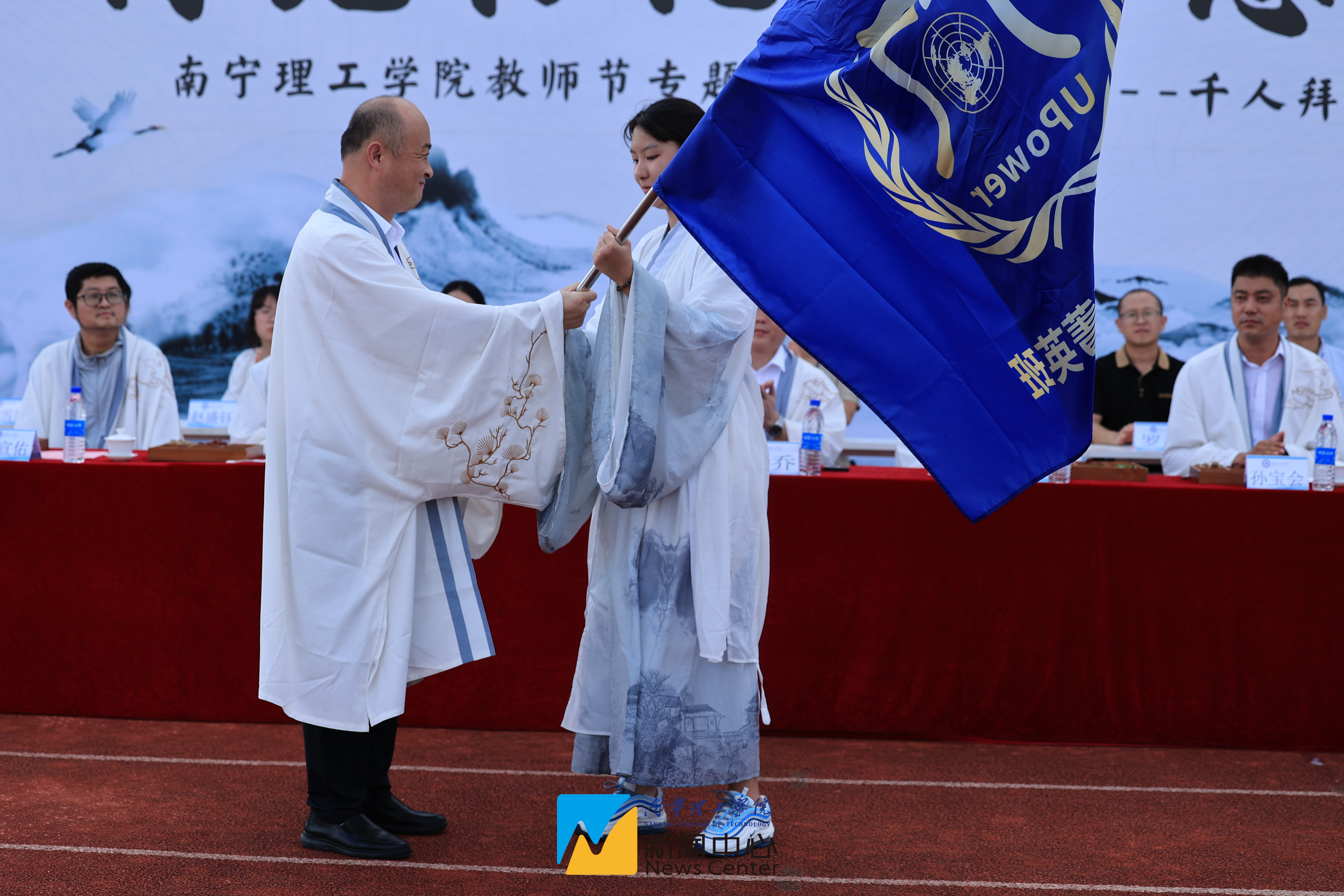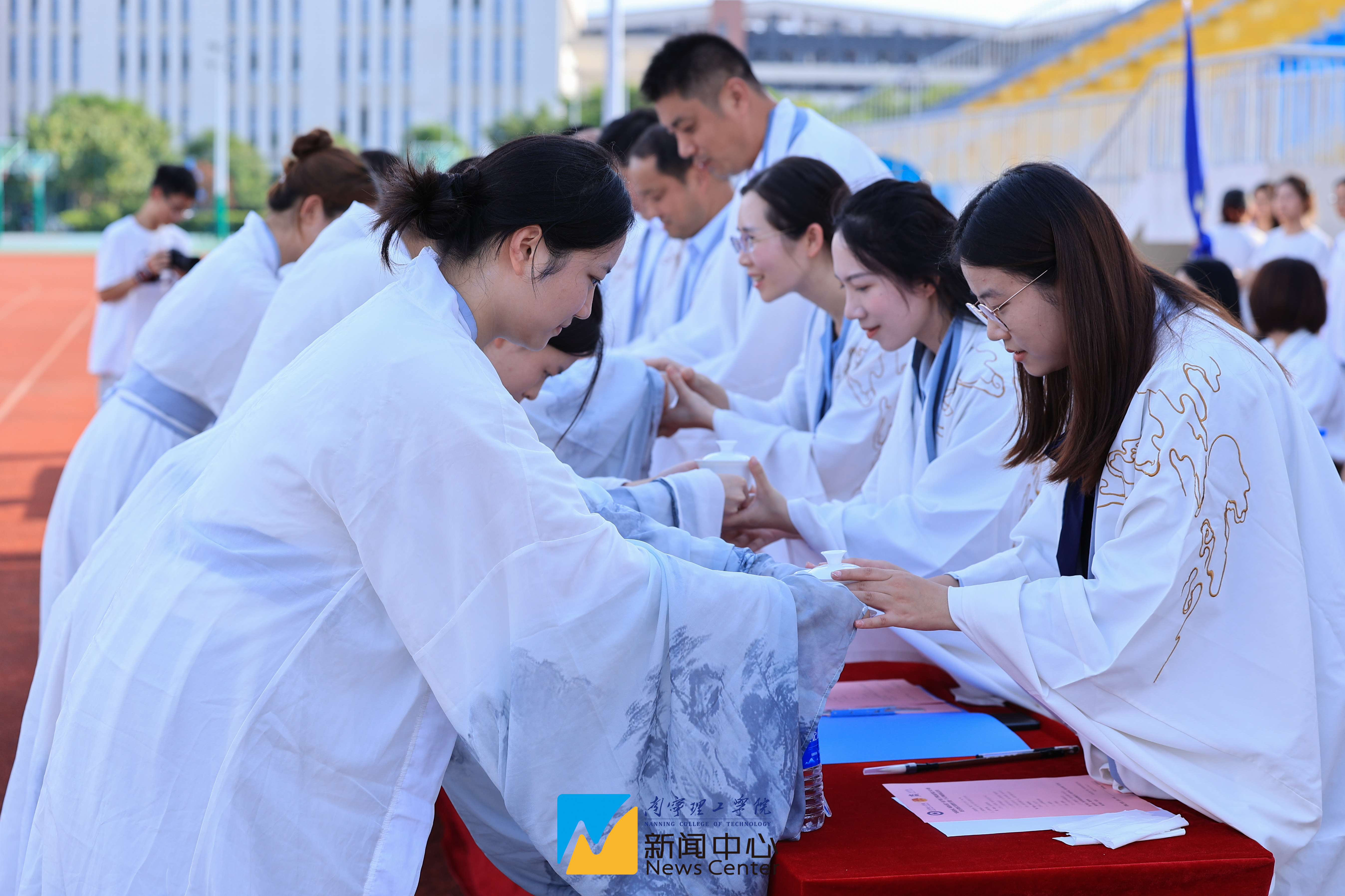 典礼在古典乐舞中启幕,会计教研室教师代表黄意津勉励新生珍惜韶华、勤学笃行,商务菁英班新生代表李泽卓轩代表全体新生向老师们表达了诚挚的感谢与崇高的敬意,呼吁同学们以虚心、踏实和感恩之心投入学业。学校党委副书记、副校长韩乔阐释典礼深意,强调拜师礼是对中华师道文化的回归,嘱托学子以“厚德为基、博学为径、弘毅为魂、自强为志”为准则。传统拜师环节,新生代表双手为老师上茶,呈递象征诚心的束脩六礼,来表达对老师们的敬意,各位老师们回赠笔墨典籍寄寓育人厚望,全体新生行三叩首礼并齐诵尊师誓言。随后校长助理郑方兵训诫勉励全体新生,望同学们能不负学校嘱托。仪式最后,学校纪委书记、校长助理马纪涛为商务菁英班授旗,全体学生行谢师礼,千人集体谢师在庄重氛围中圆满落幕。