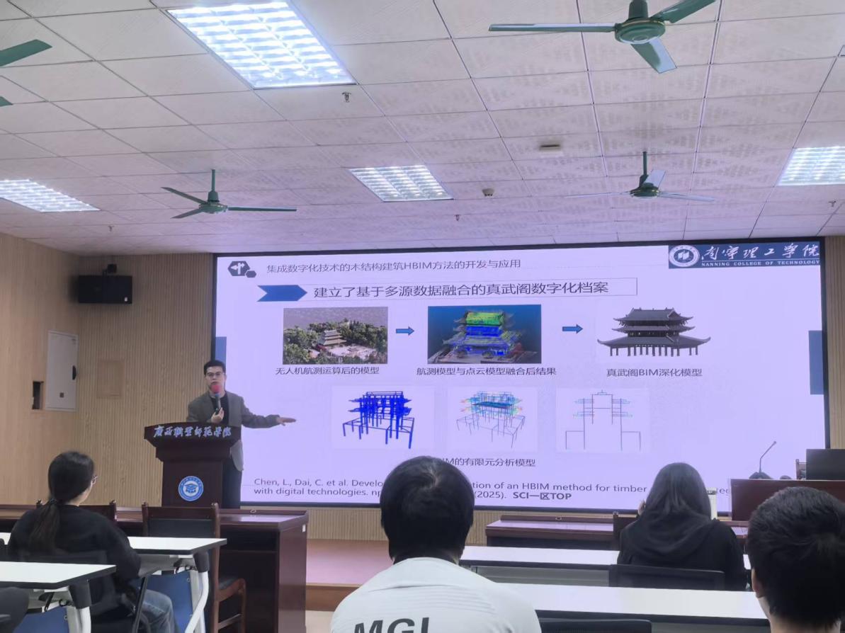 讲座中,陈链鑫老师紧密结合古建筑保护行业的发展趋势和广西木结构古建筑的保护现状与需求,深入系统地阐述了无人机倾斜摄影、三维激光扫描、无损检测等数字化技术在古建筑保护中的集成创新应用,并以广西容县真武阁数字化保护项目为典型案例,深入解析了如何运用数字化技术实现古建筑的精准测绘建模、结构分析、病害诊断等关键问题。讲座尾声,陈老师寄语同学们:“古建筑保护任重道远、道阻且长,前路浩浩荡荡,吾辈仍需砥砺前行”。