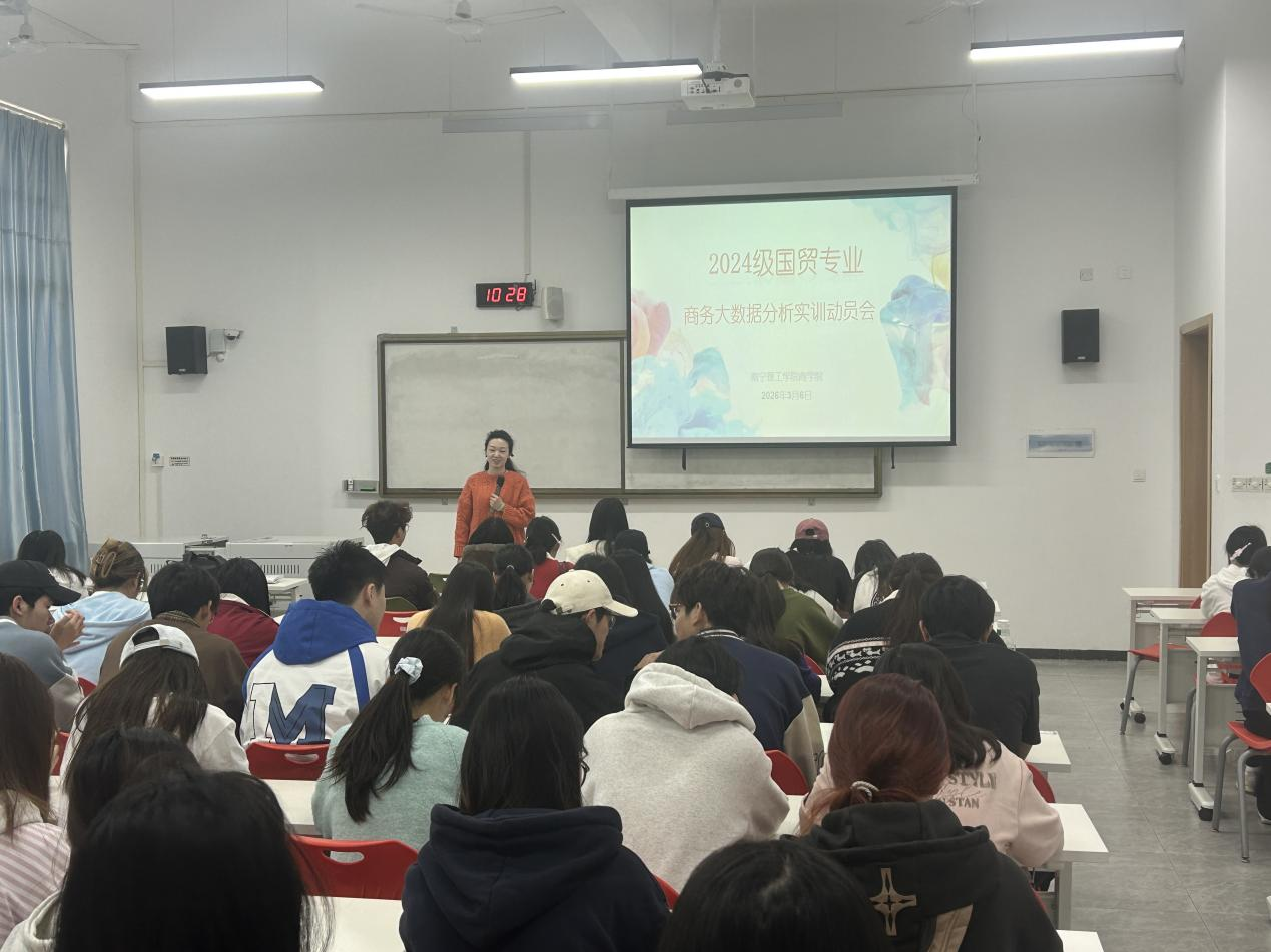 为顺应数字经济时代发展需求,提升商科学生商务数据分析与应用的实战能力,2026年3月6日上午,商学院24级国际经济与贸易专业商务大数据分析实训动员会在A3104顺利举行。陈宣佑、彭晓琼两位老师担任本次实训的指导教师,2024级国贸专业全体学生参会。