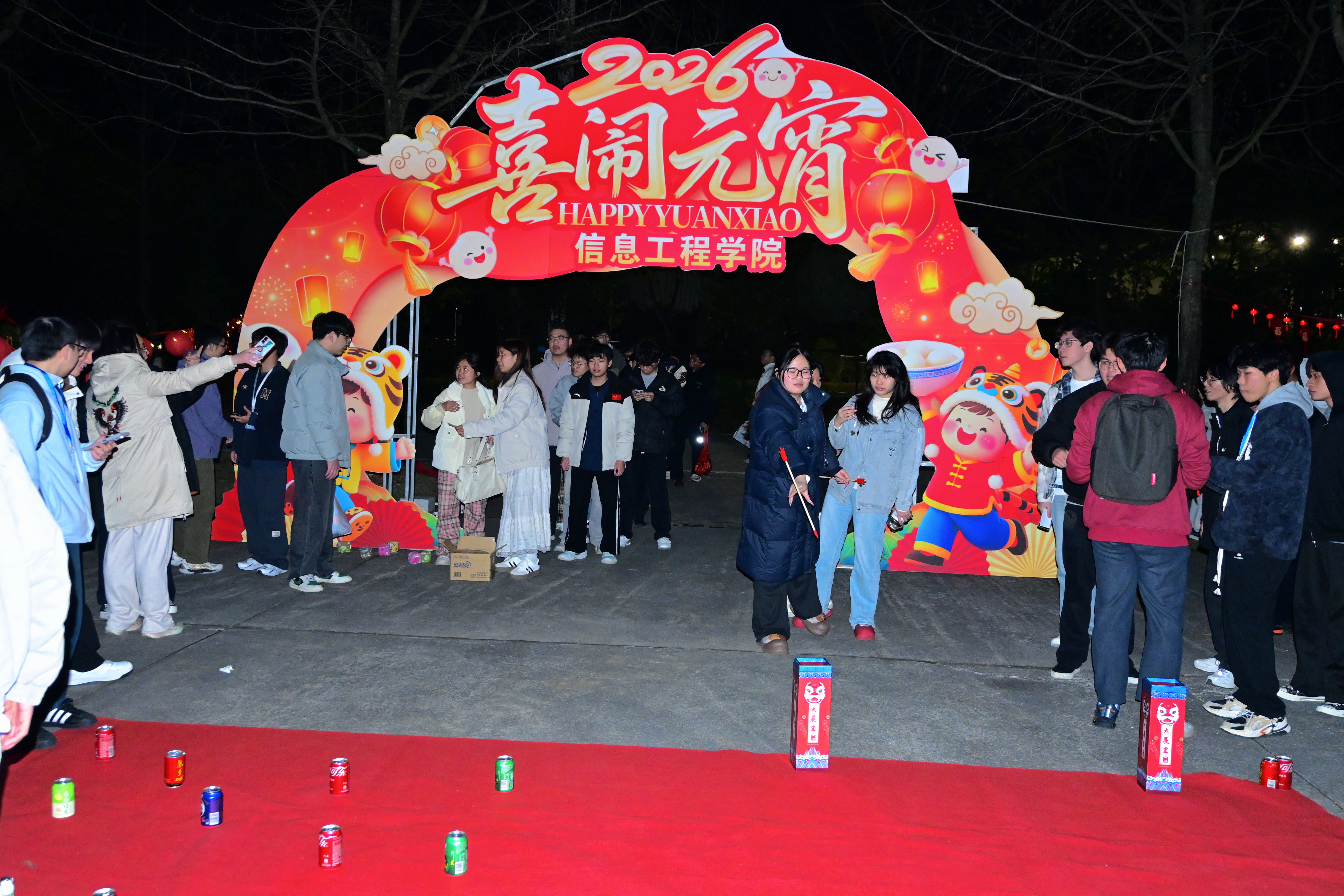 猜灯谜是元宵佳节的经典项目,活动筹备组精心筛选了涵盖信息技术、传统文化、历史典故、生活常识等多个领域的灯谜,既考验知识储备,又兼具趣味挑战。一条条妙趣横生的灯谜吸引了大批师生驻足思考、踊跃抢答。大家三五成群,或低头沉思,或热烈讨论,或欢呼雀跃地兑换奖品,现场欢声笑语不断。另一边的投壶竞技区同样热闹非凡,古朴的投壶器具整齐摆放,吸引了众多师生跃跃欲试,体验这项传承千年的传统游戏。有的师生身手矫健,箭矢精准入壶,赢得阵阵喝彩。