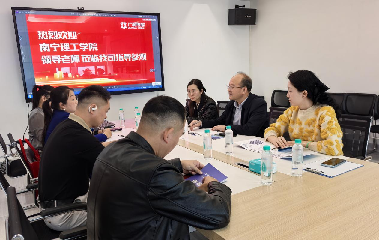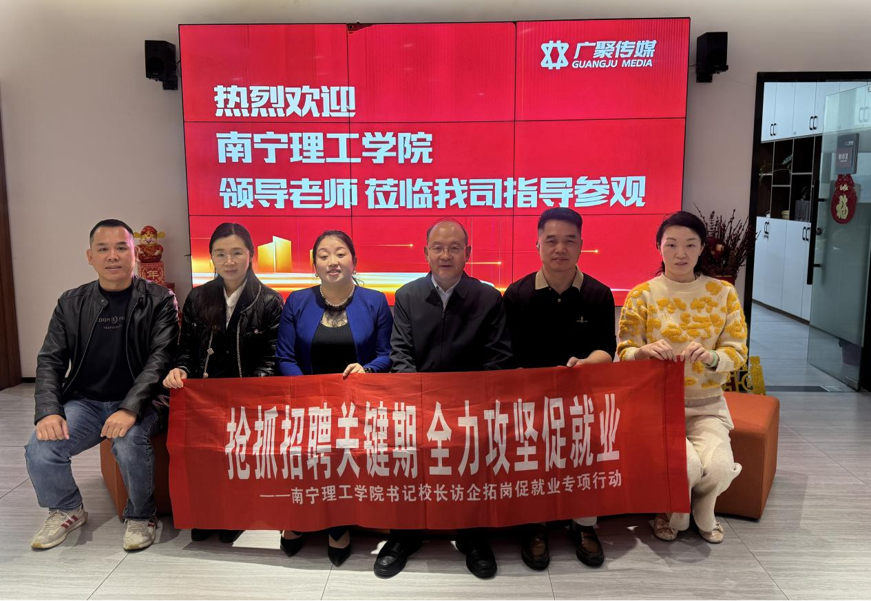 为推动产教深度融合,深化校企合作与供需对接,全力促进2026届毕业生高质量充分就业,2026年3月3日上午,我校校长王金叶带队,商学院党总支书记姚顺良、工商教研室主任彭晓琼一行前往广西广聚文化传播有限公司(以下简称“广聚传媒”)开展访企拓岗专项行动,与该公司董事长彭贵、总经理刘鹏及企业代表进行了深入交流与座谈。