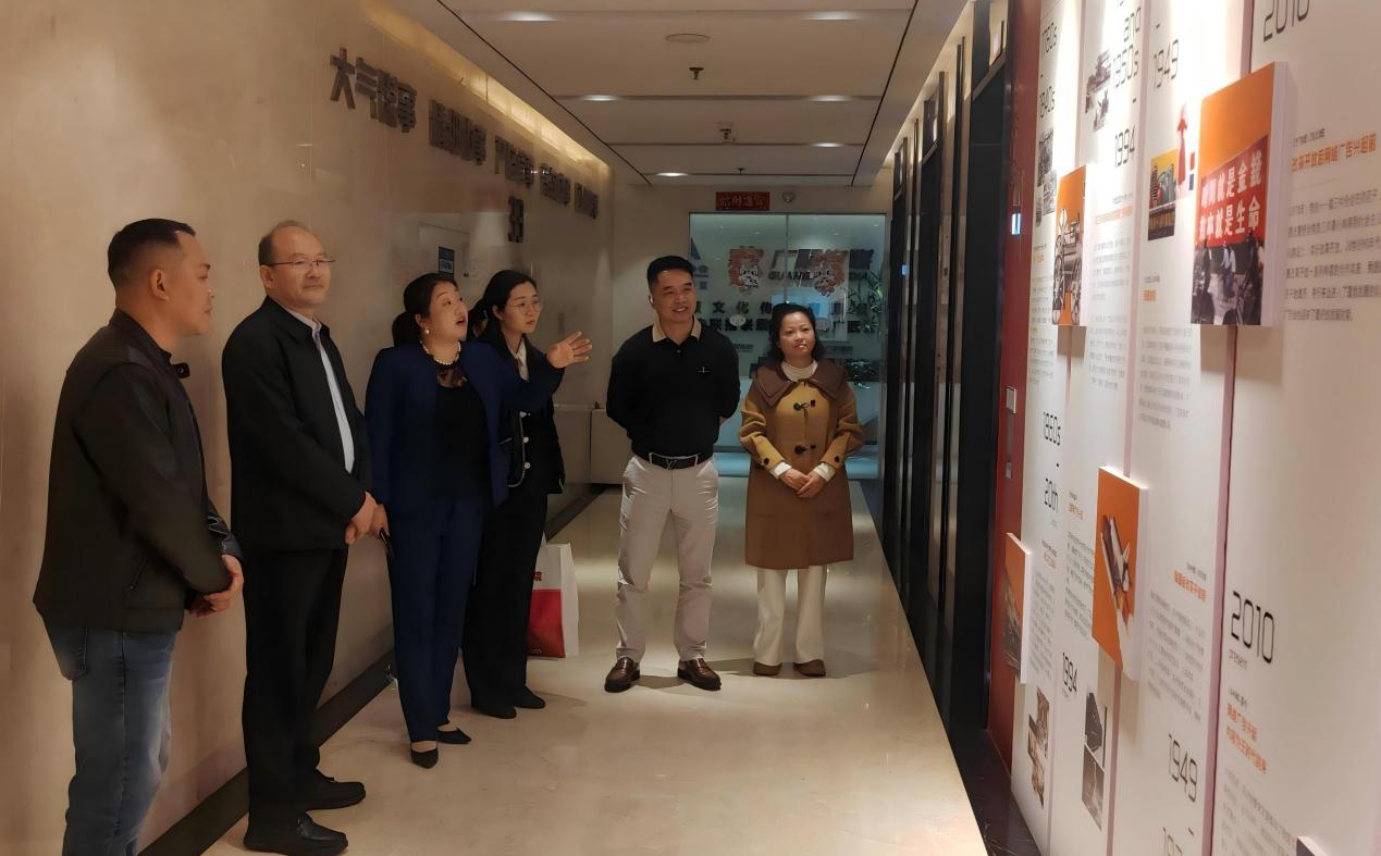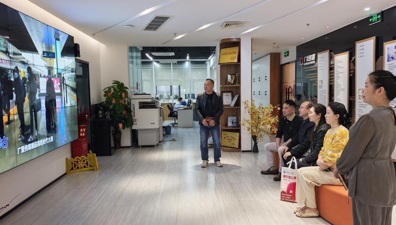 抵达企业后,我校一行在董事长彭贵、总经理刘鹏的陪同下,实地参观了公司总部的办公环境、企划部门及文化展示区,详细了解了企业的运营模式、业务范畴及近年来在文化传播等领域取得的成果。品牌、销售总监余宗季通过宣传片及现场讲解,详细介绍了企业发展历程、核心业务板块、运营模式和企业文化,广聚传媒在文化创意、品牌策划、高铁广告等领域展露出的专业实力和创新精神,令人印象深刻。