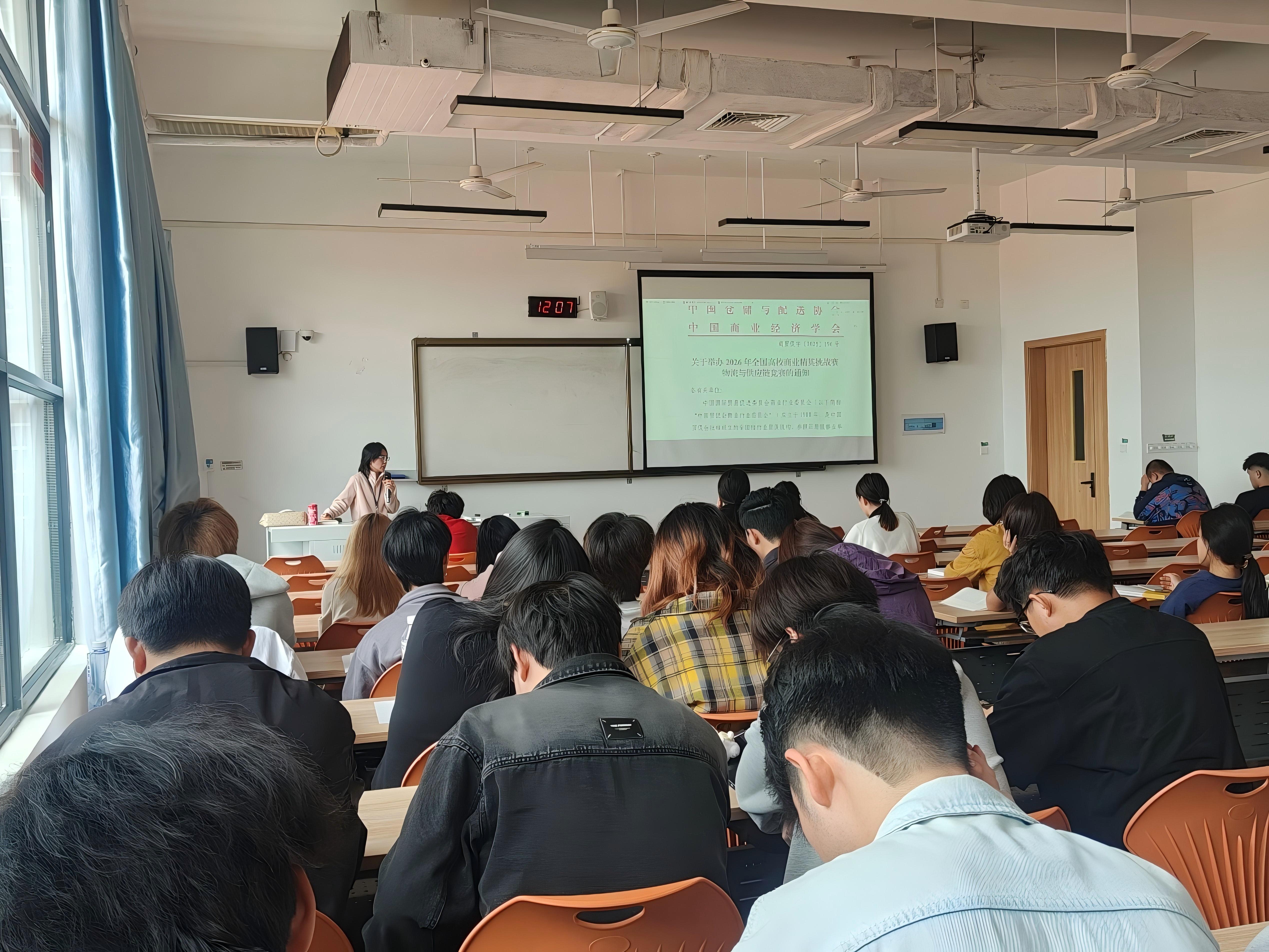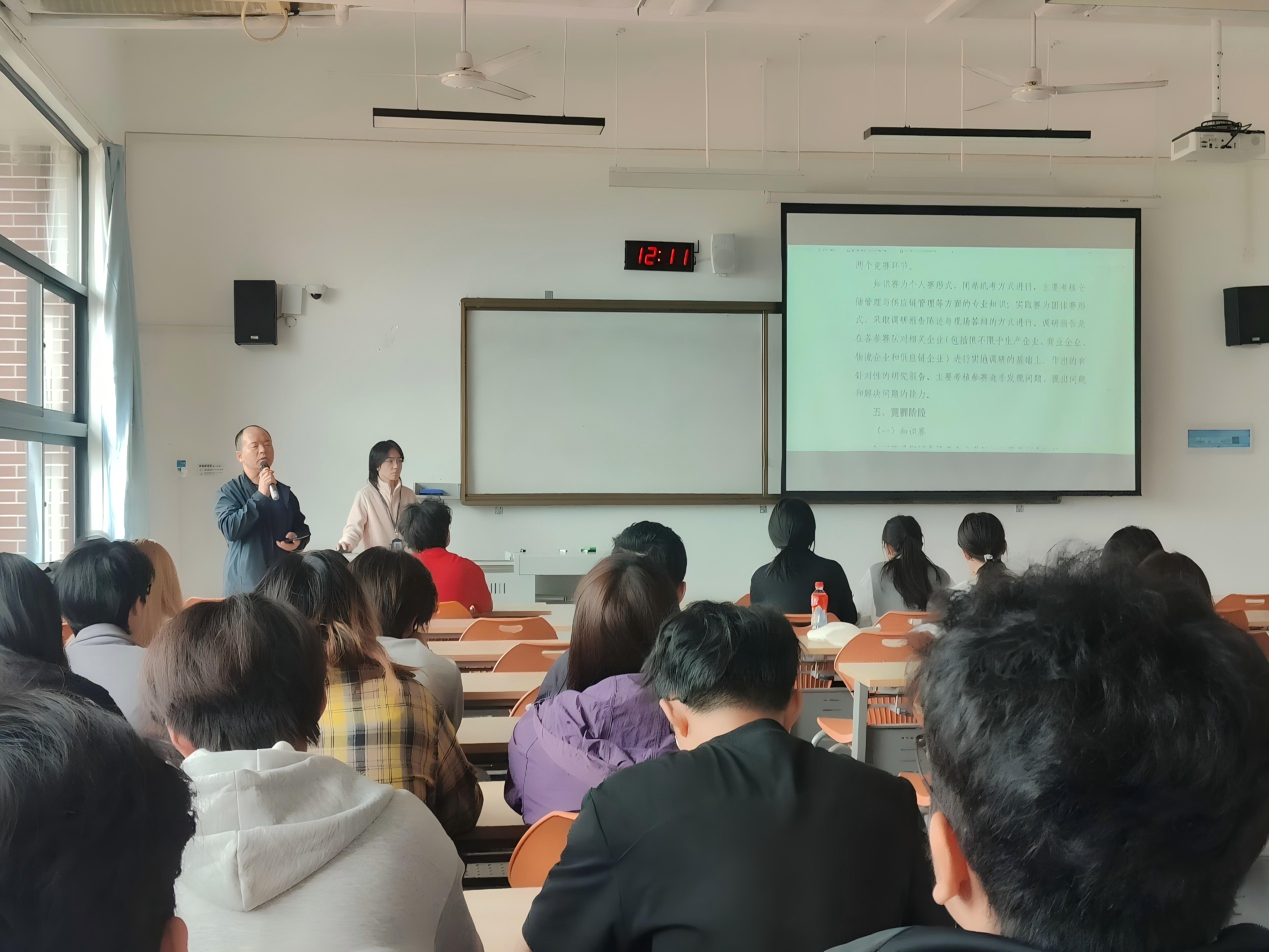 随后,谢启禧老师围绕赛事核心内容展开全方位细致讲解,将比赛规则、参赛流程与工商专业学习要点紧密结合,让同学们对赛事形成系统且清晰的认知,并介绍比赛活动将围绕理论学习与专业技能操作两大核心内容展开,目前有两个赛道供学生自由选择:物流与供应链竞赛、创业计划赛道。