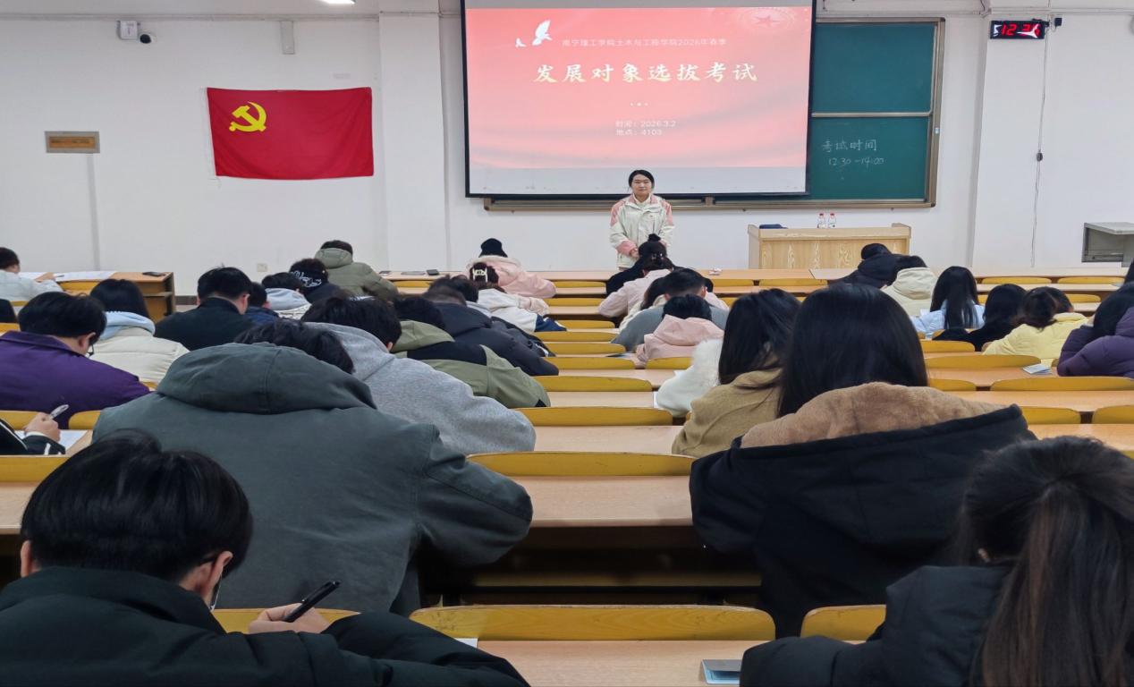 为强化党员发展对象培养考察,夯实基层党组织建设,严把党员发展入口关,引导发展对象深学细悟党的创新理论、党的二十届四中全会精神与习近平总书记重要讲话精神,切实提升党员发展质量,土木与工程学院于2026年3月2日12:30,在教学楼 4103 教室组织开展春季党员发展对象理论考试。