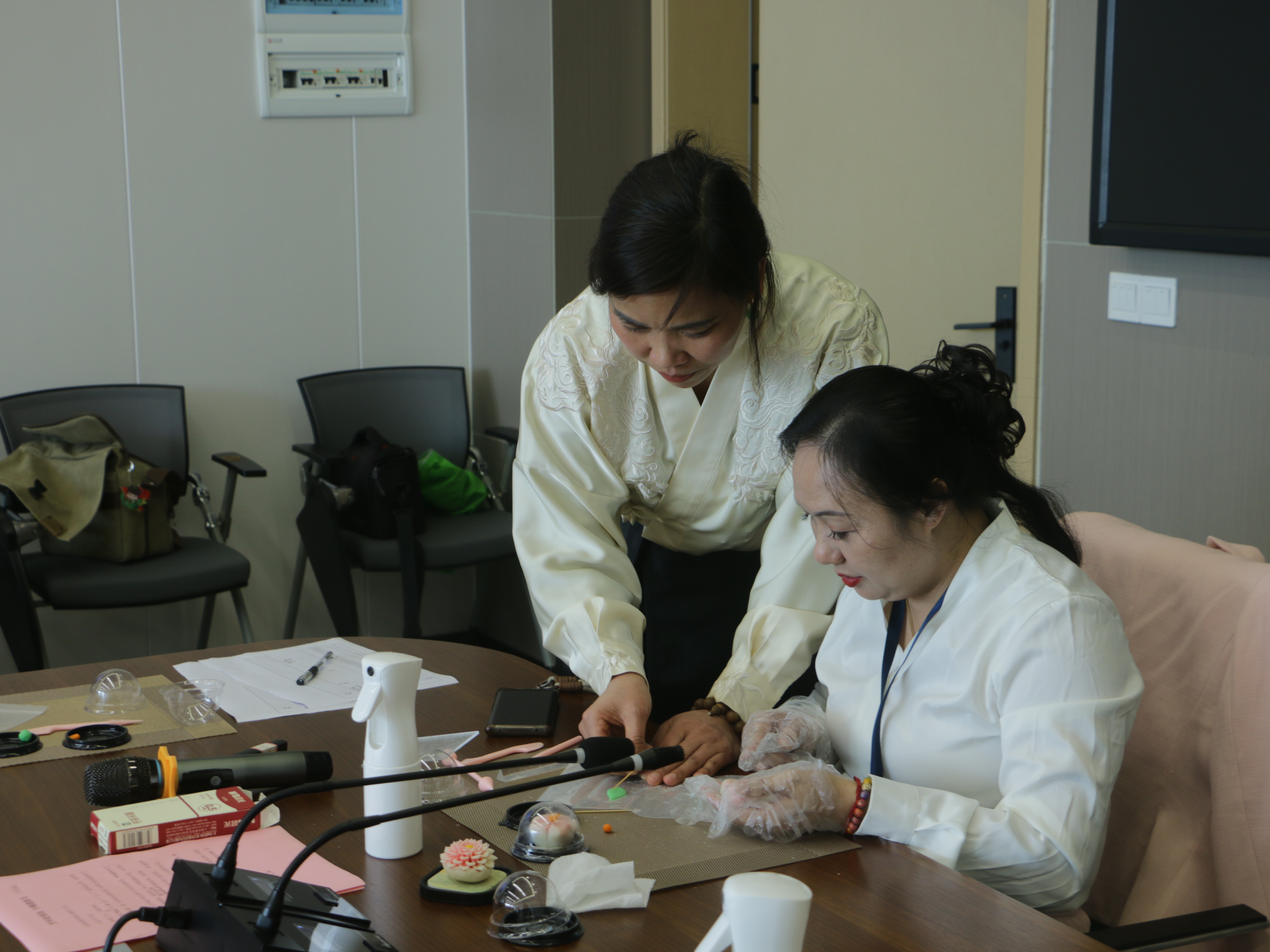 (图5 非遗指导教师现场教授女教职工制作茶果子)