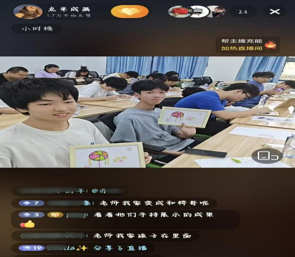 完成作品后,活动进入精彩的成品展示环节。同学们在现场向直播间展示自己亲手制作的点米成画作品,这些作品题材丰富,有可爱的“壮妞”形象、雅致的莲花图案,也有寓意美好的吉祥纹样绣球,每一幅都凝聚着同学们的心血。大家纷纷分享自己的创作心得与活动感受,讲述对非遗技艺的新认知。曹老师对部分同学们的作品进行点评,肯定大家的用心与布局,同时提出优化建议,鼓励同学们继续感受非遗之美,争做非遗文化的传播者,现场掌声不断,洋溢着收获的喜悦。