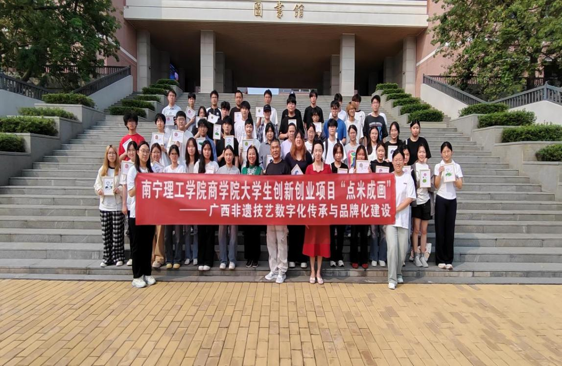 为迎接即将到来的“三月三”,弘扬优秀传统文化,让非遗技艺走进校园、浸润青春心灵,2026年3月31日下午,大学生创新创业项目团队【“点米成画”——广西非遗技艺数字化传承与品牌化建设】在商学院囤荣立和彭晓琼两位老师的指导下,在A4102教室成功举办了“点米成画进校园,非遗薪火润青春”非遗技艺传承主题活动。活动邀请到“点米成画”非遗传承人曹文碧老师来到校园内亲临指导,25级工商专业学生受邀积极参与。