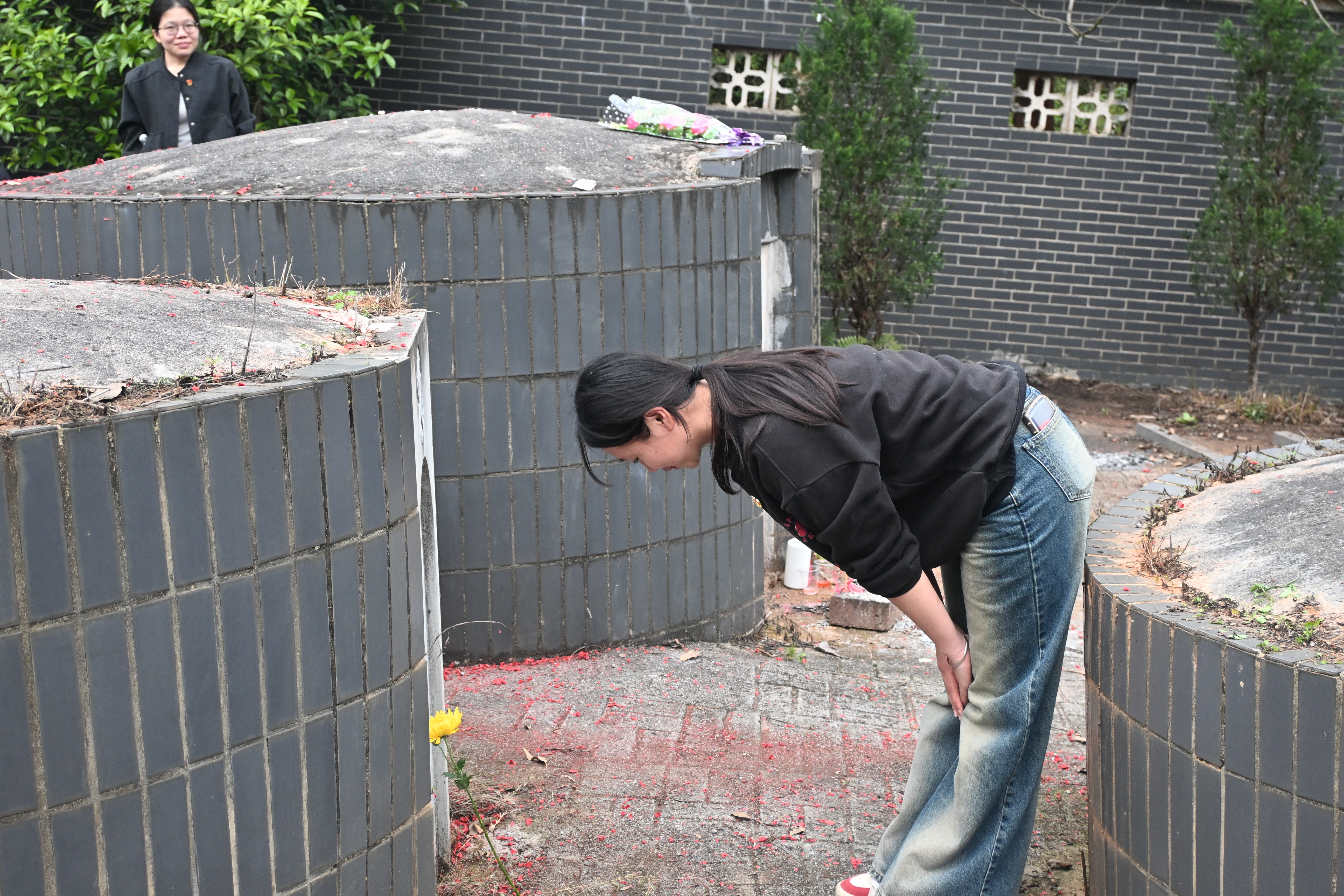 祭扫正式开始,在苍松翠柏的见证下,一场跨越时空的对话悄然展开,教师党员带领学生党员依次将鲜花敬献于墓前,并深情鞠躬;退役军人系统的工作人员手持干净的毛巾,教导其余代表小心翼翼地拂去烈士墓碑上的浮尘与落叶。