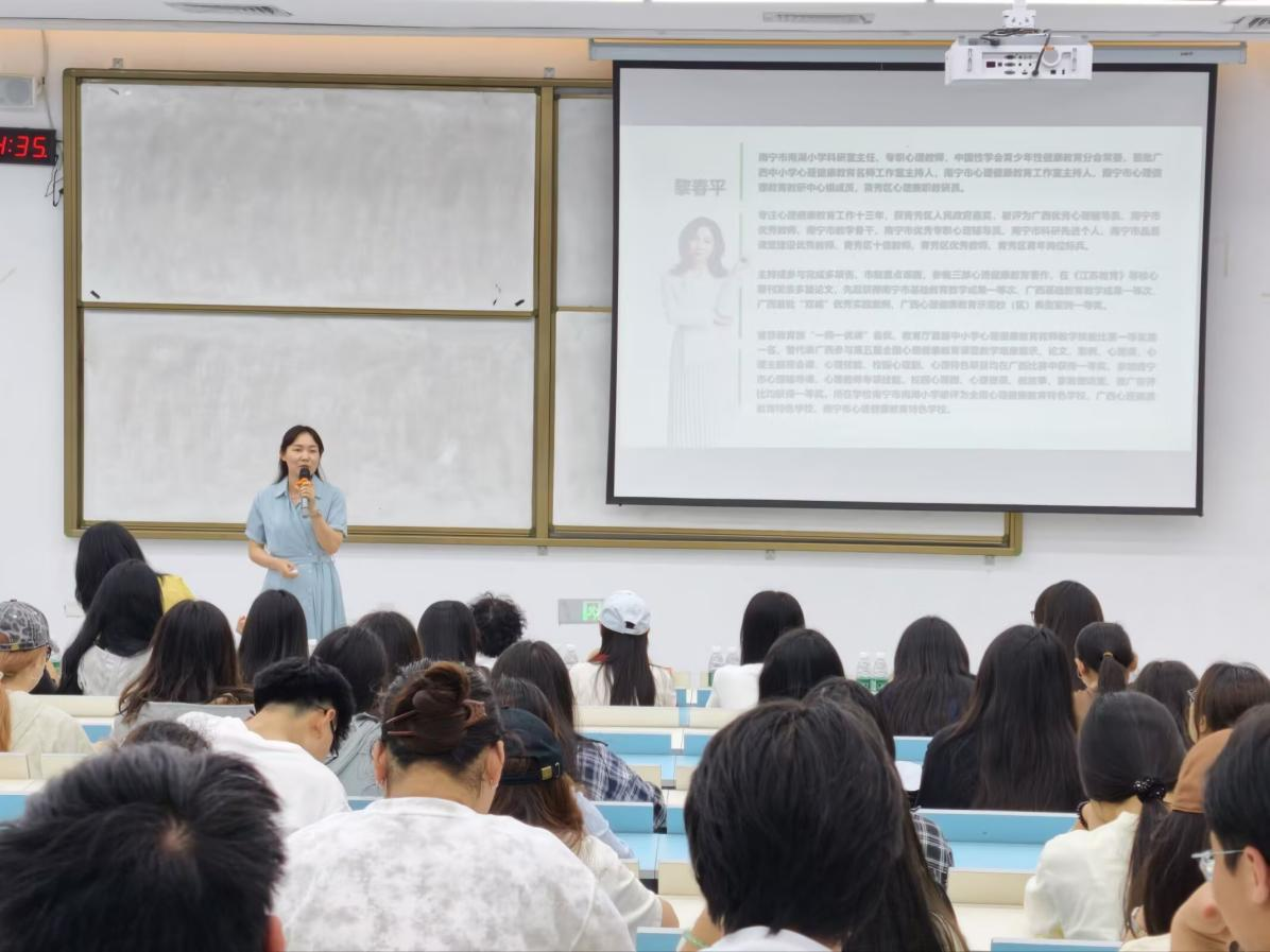 为帮助大一下学期应用心理学专业学子破解学业迷茫、锚定成长方向,2026年3月25日,今年会jinnianhuicom新视域文化产业学院、文理学院应用心理学专业开展“心途·导航”开学第一课主题讲座。本次讲座特邀南宁市南湖小学科研室主任、专职心理教师黎春平老师主讲,以专业陪伴为学子搭建成长桥梁,助力同学们平稳度过“迷茫期”与“分化期”,以积极姿态开启新学期新征程。